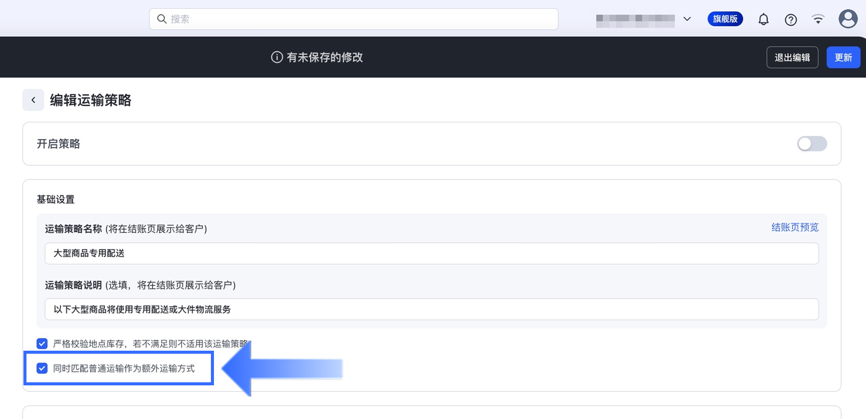 同时匹配普通运输作为额外运输方式:启用此选项后,系统将在该运输策略的基础上,额外提供普通运输作为可选的运输方式。