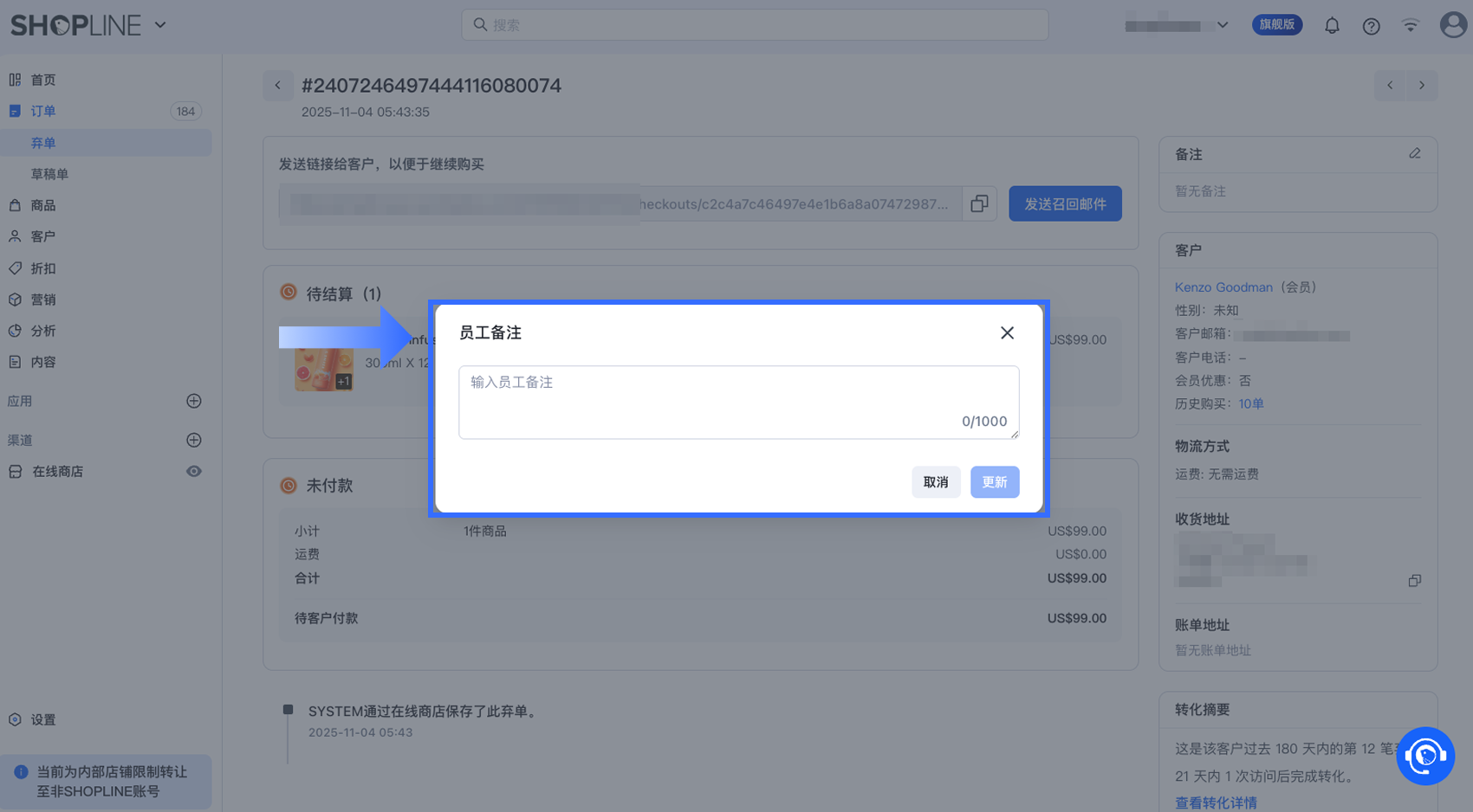 添加【员工备注】可帮助您的团队在弃单记录中同步跟进信息,例如已执行的动作、跟进时间,以及当前负责人。这在处理需要一对一跟进的高客单价弃单时尤其有用。
