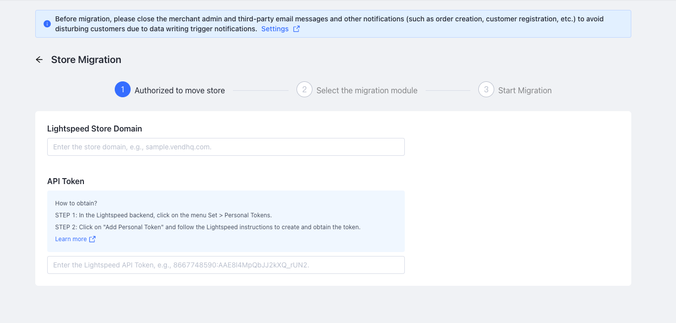 前往 SHOPLINE 应用市场,搜索【多平台店铺一键搬迁】,安装完后即可使用。 - 进入搬迁应用,填写 LightSpeed 店铺信息。