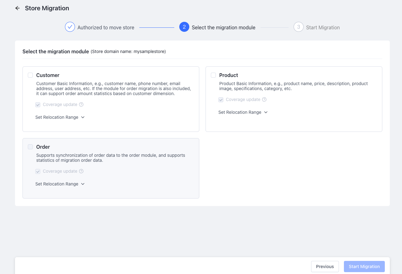 备注:当前支持“handle”、“handle.myshopify.com”、“admin.shopify.com/store/sample”三种域名格式。 - 选择搬迁模块。