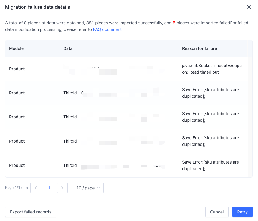 搬迁结果可能会存在失败的情况,如果请求超时、数据格式不对应。某些情况可通过点击搬迁重试进行解决,某些重试无法解决的问题可反馈给商家运营人员进行处理。