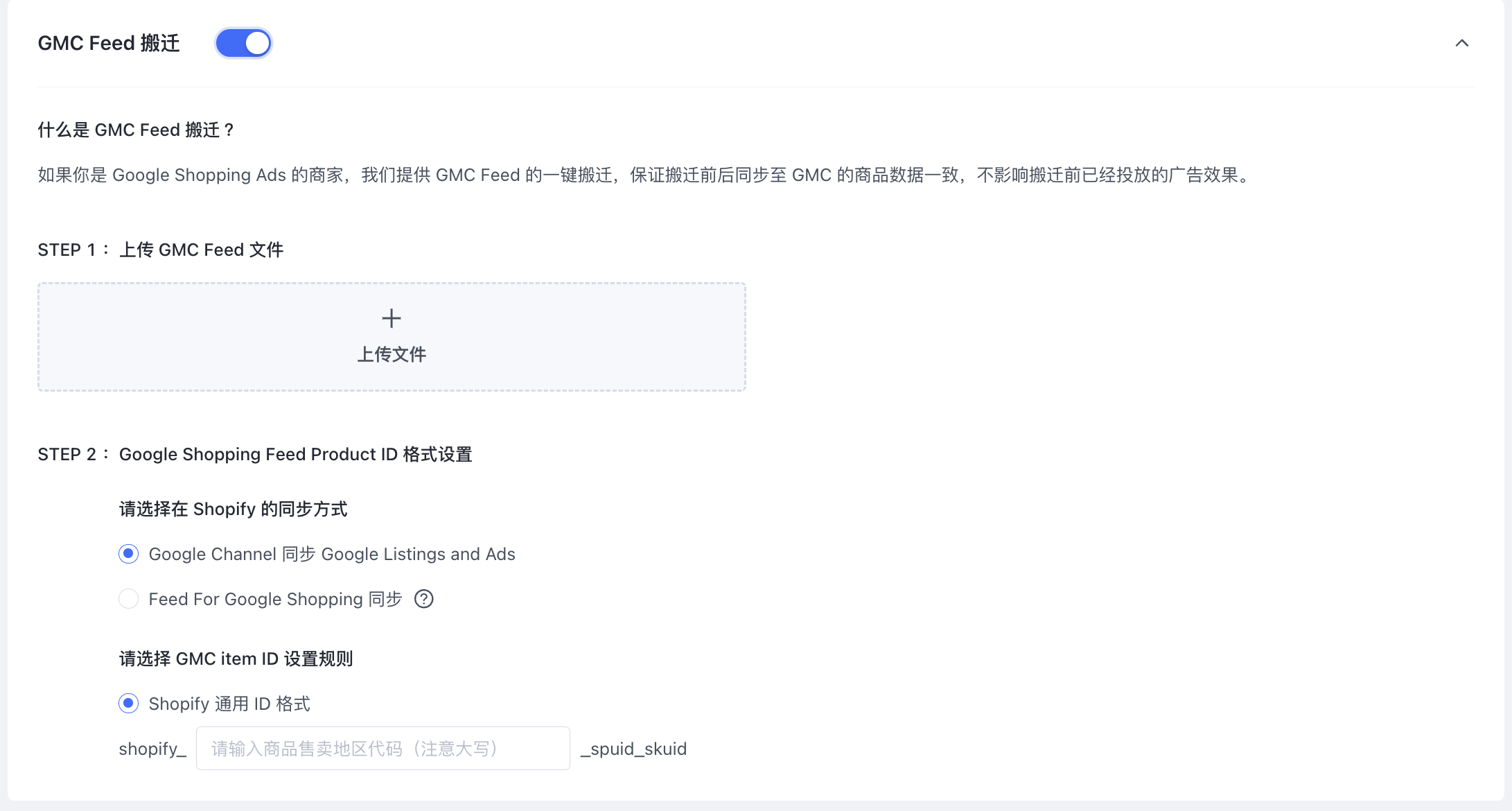 - 高级设置 -feed 同步时,需注意在 Shopify 所选择的 ID 同步规则。如选择规则不对与原 Shopify 渠道同步不一致则会影响已投放广告的广告效果。