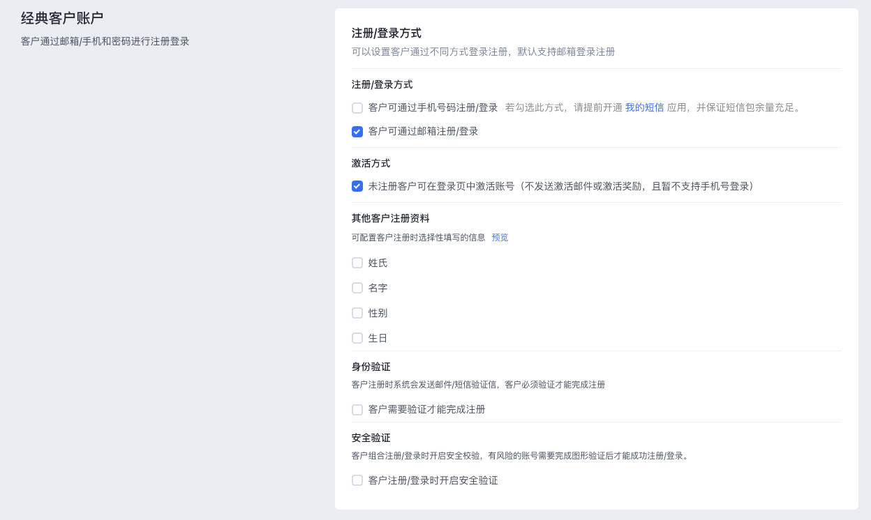 备注:如之前已使用其他搬迁工具(如表格导入、商品模块的“Shopify 一键搬家”功能),对于之前已搬迁的商品 feed id 规则不会生效。如需搬迁商品 feed id,需删除原来不是搬迁应用创建的商品。 - Shopify 店铺的【客户】数据搬迁过来后,由于是两个不同的系统,所以需要进行邮件激活账号,可前往【设置】>【客户账户】>【经典客户账户】进行激活方式设置,勾选【激活方式】后用户登录时,仅需通过验证码验证,即完成重新激活。无需发送批量激活邮件或激活奖励。