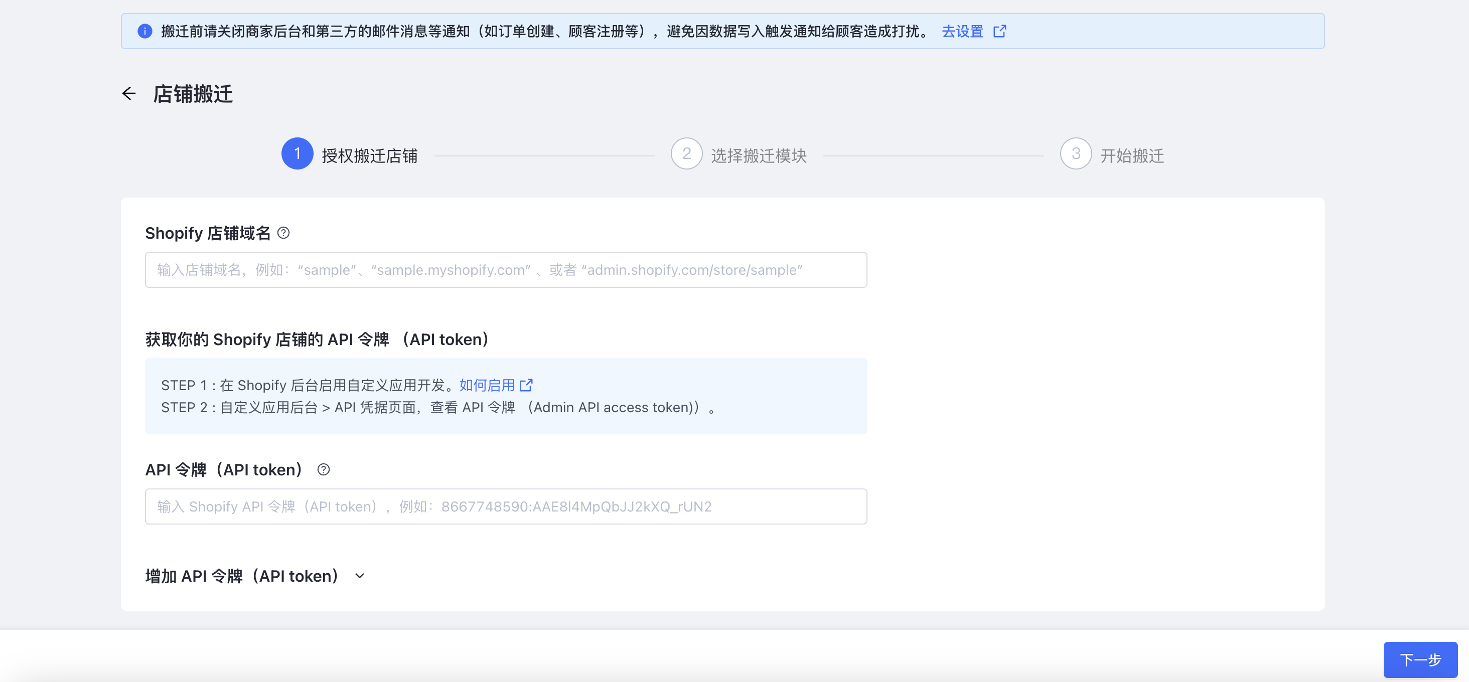 前往 SHOPLINE 应用市场,搜索【多平台店铺一键搬迁】,安装完后即可使用。 - 在应用中,输入 shopify 店铺的域名(例如:sample.myshopify.com),将获取密码 Password(对应Shopify-Admin API access token)粘贴入 SHOPLINE 后台的搬迁工具应用中,并点击【下一步】。当店铺数据量过大时可通过增加第二个Shopify应用,把第二个应用的Token填充至增加API令牌。(如为Shopify Plus套餐店铺,则无需新增第二个应用)