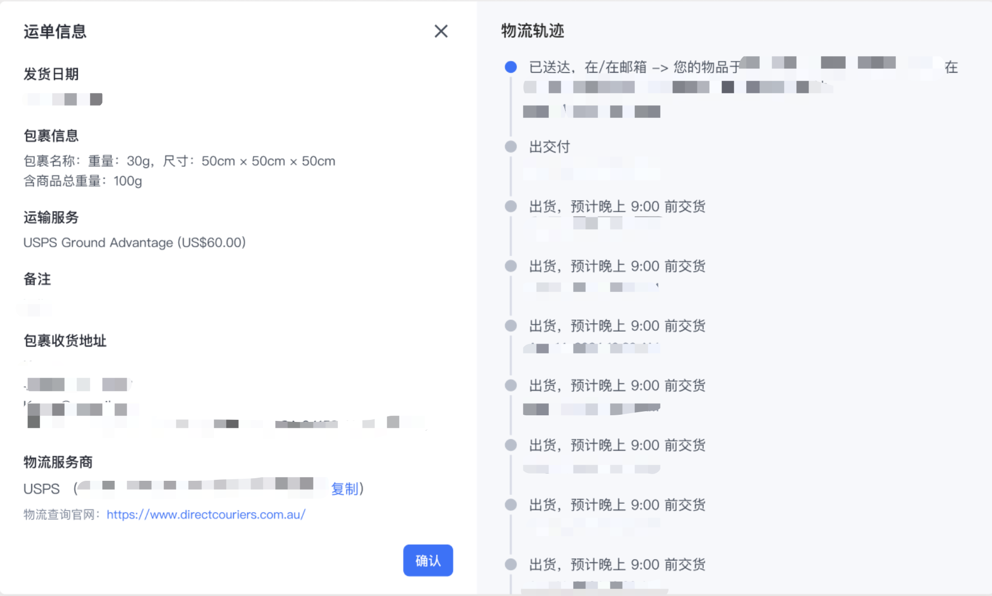成功购买运输标签(单个或批量)后,相应订单的状态将自动更新为【已发货】。此时,追踪信息已填写完毕,无法再手动编辑。