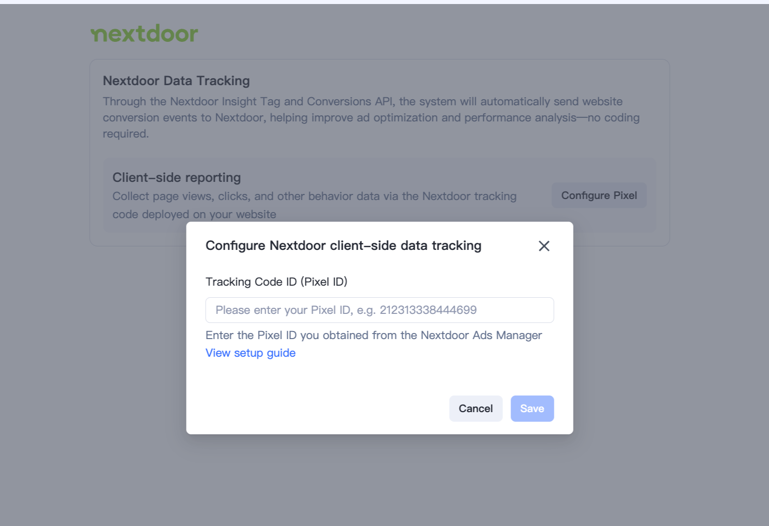 - 复制您的 Pixel ID,并返回 SHOPLINE 后台 > Nextdoor > 数据追踪设置。将 Pixel ID 粘贴到 Pixel ID 输入框。