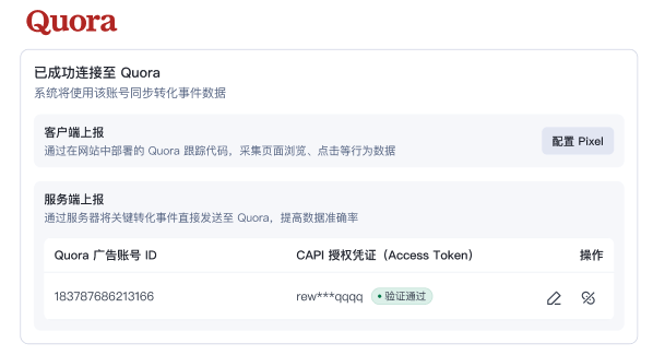 - 展示绑定的广告账号、Pixel ID 与部分隐藏的 Access Token 信息