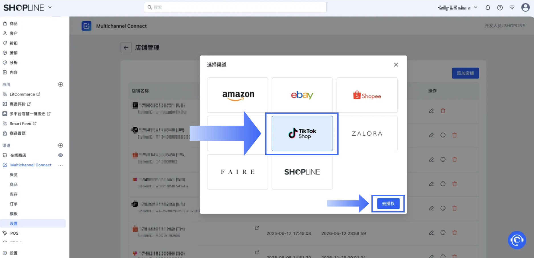 - 授权 TikTok 店铺: 进入「Multichannel Connect」>【设置】>【店铺设置】,点击右上角的【添加店铺】进行店铺授权。