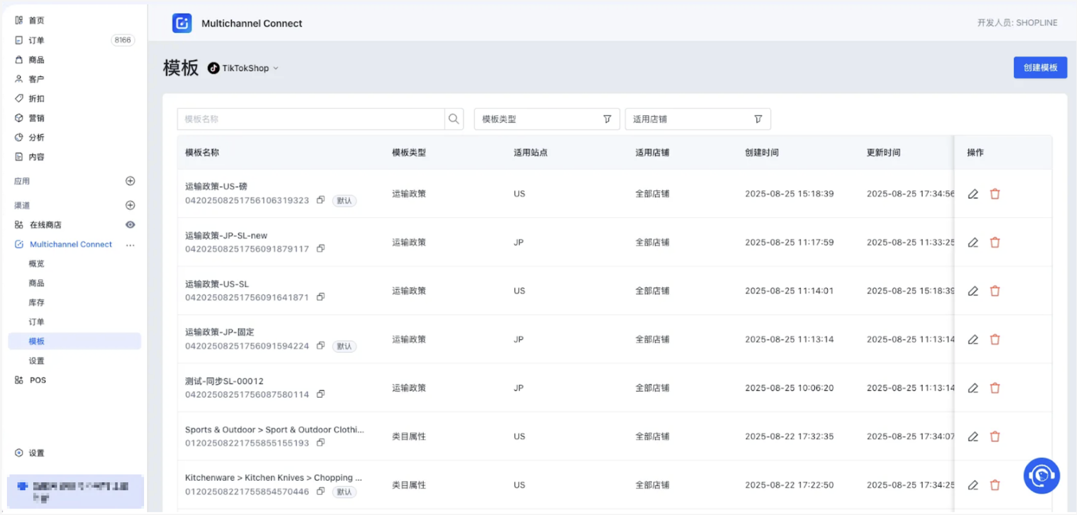 - 创建商品刊登模板(可选):在「Multichannel Connect」的【模板】页面创建商品刊登模板,TikTok 分为类目属性模板和运输政策模板。操作详见:利用模板刊登TikTok商品