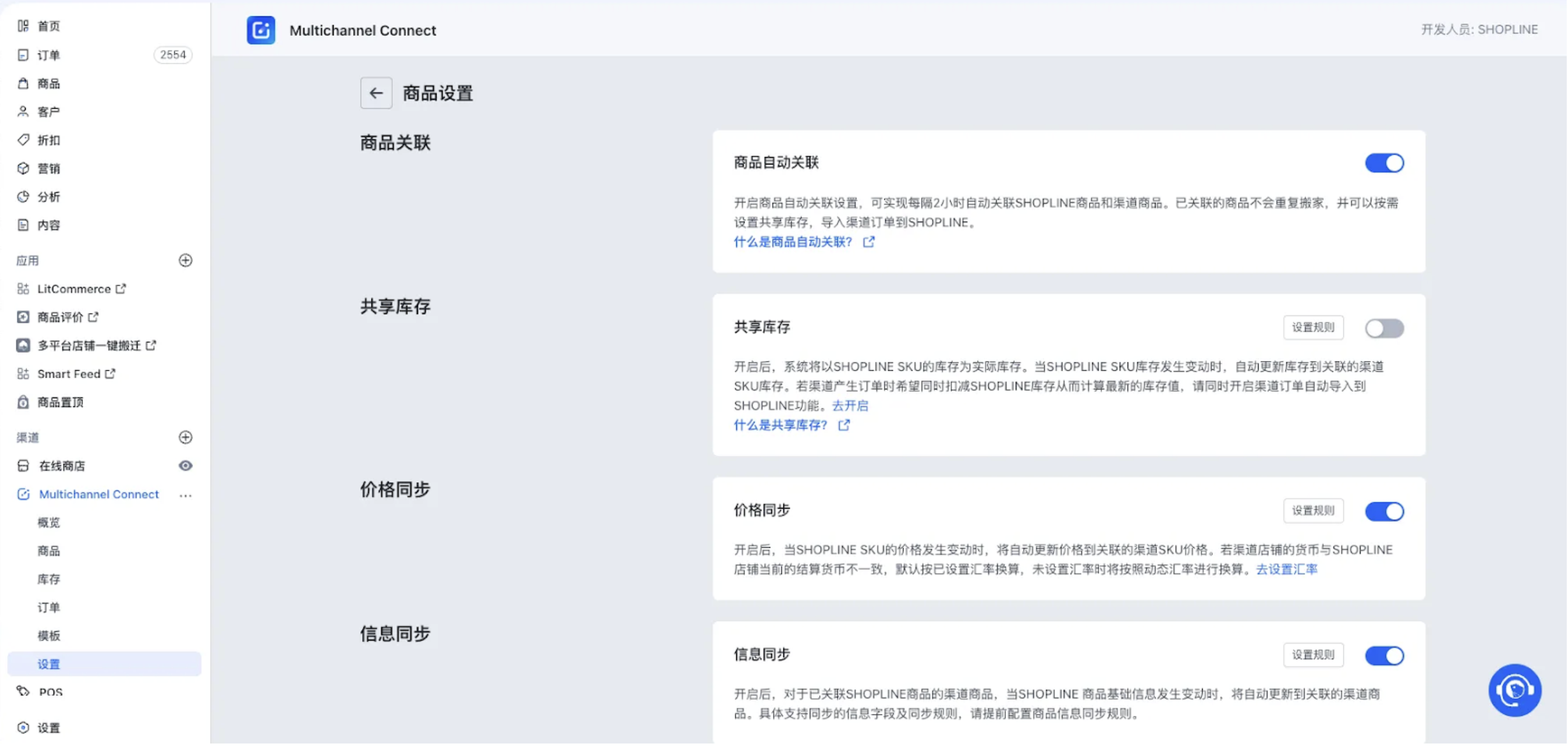 - 配置商品设置:进入「Multichannel Connect」>【设置】>【商品设置】,可以根据需要开启商品关联、商品价格同步、信息同步等。
