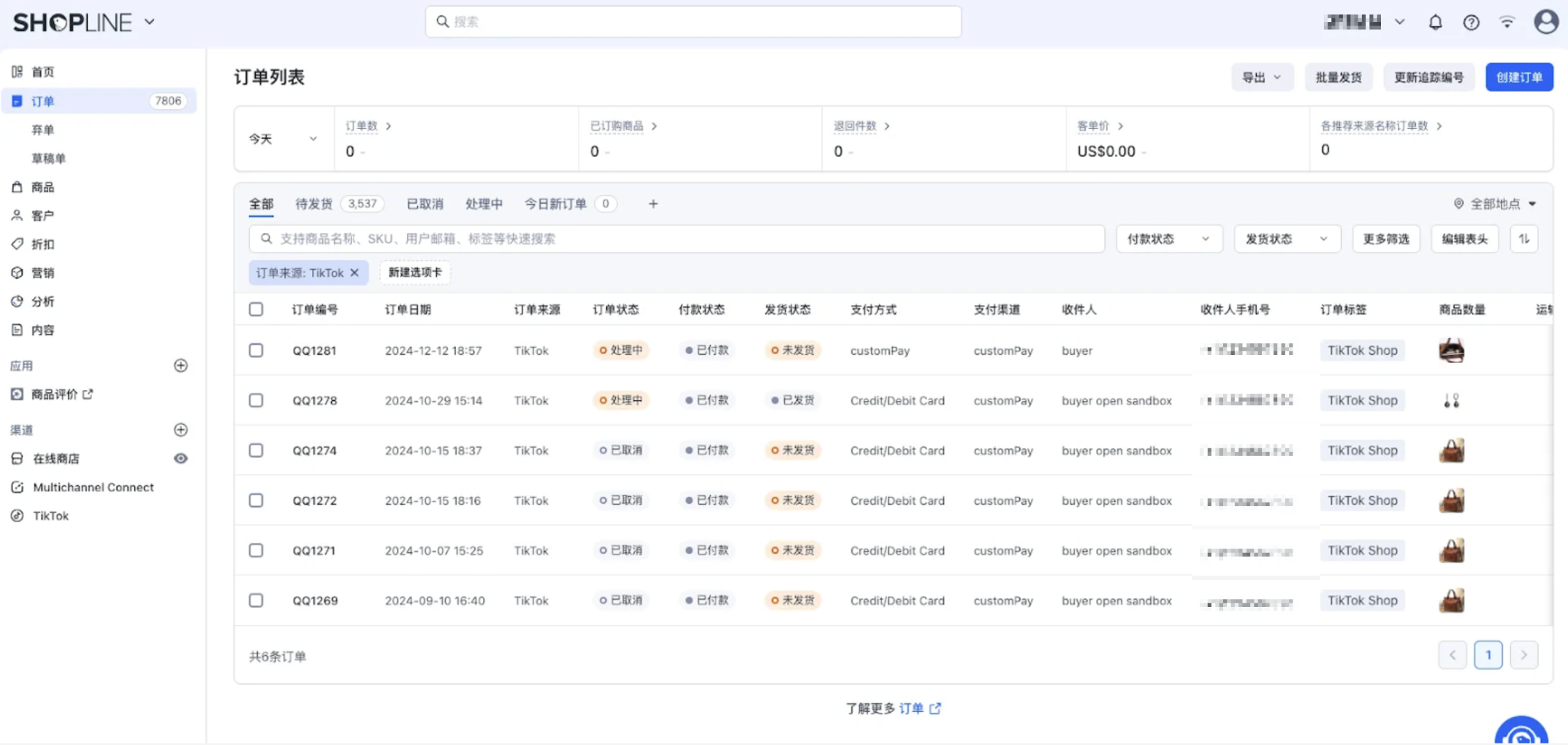 - 处理历史订单:确保历史 TikTok 订单都已导入到 SHOPLINE,并在 SHOPLINE >【订单】将这部分订单处理完成。