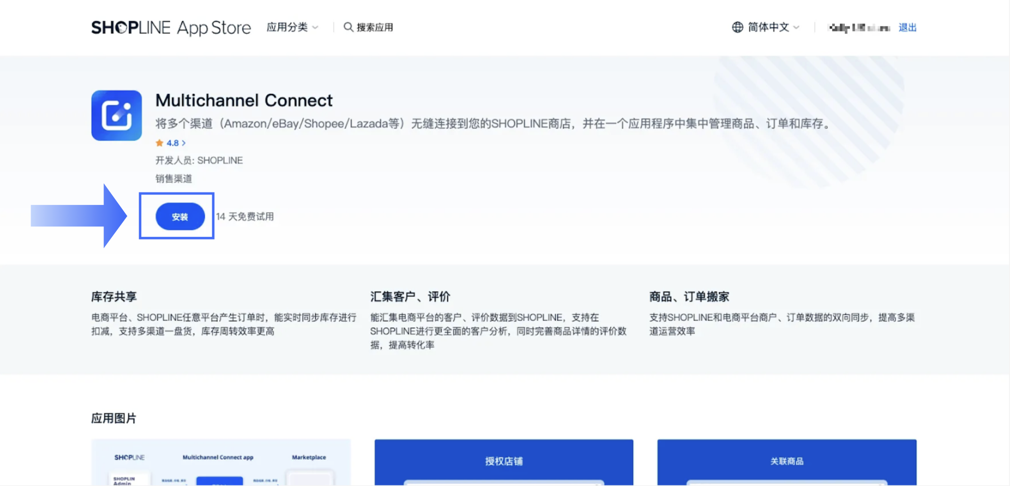 - 在 SHOPLINE App Store 搜索「Multichannel Connect」并进行安装。点击安装