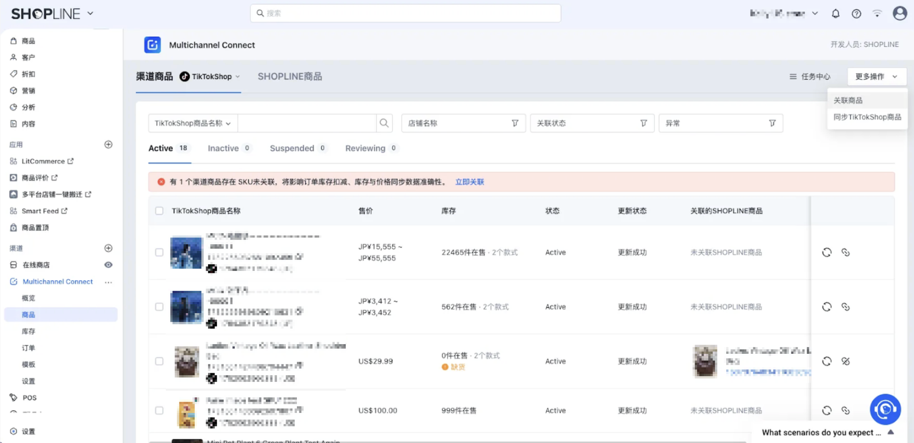 - 检查商品关联关系:进入「Multichannel Connect」>【商品】,在【渠道商品】下检查商品关联情况。是否存在尚未关联的商品或 SKU,已关联的商品和 SKU 关联关系是否正确。