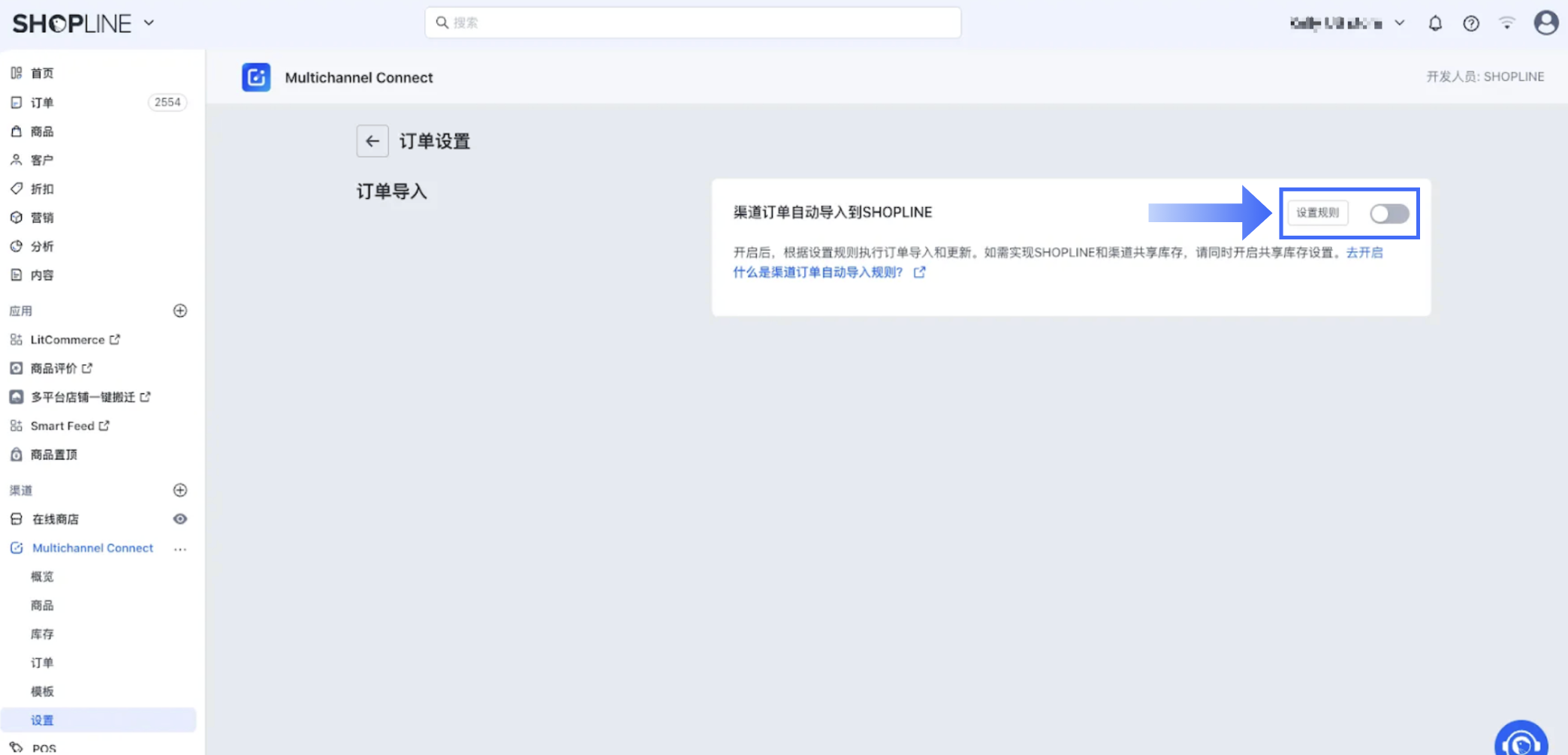 - 开启库存和订单配置:先进入「Multichannel Connect」>【设置】>【订单设置】,完成设置规则后开启【订单导入】开关。(注:请谨慎选择订单导入开始时间,避免订单重复导入)