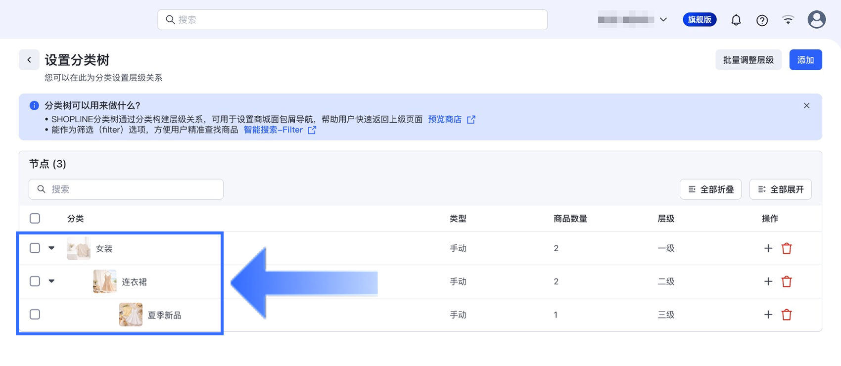 | 备注:分类树管理功能目前处于早期体验阶段。请联系 SHOPLINE 客户支持申请体验名额。 |