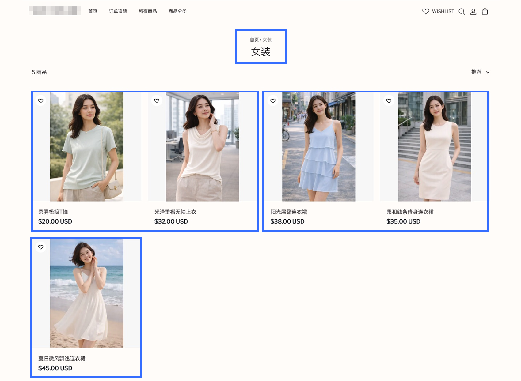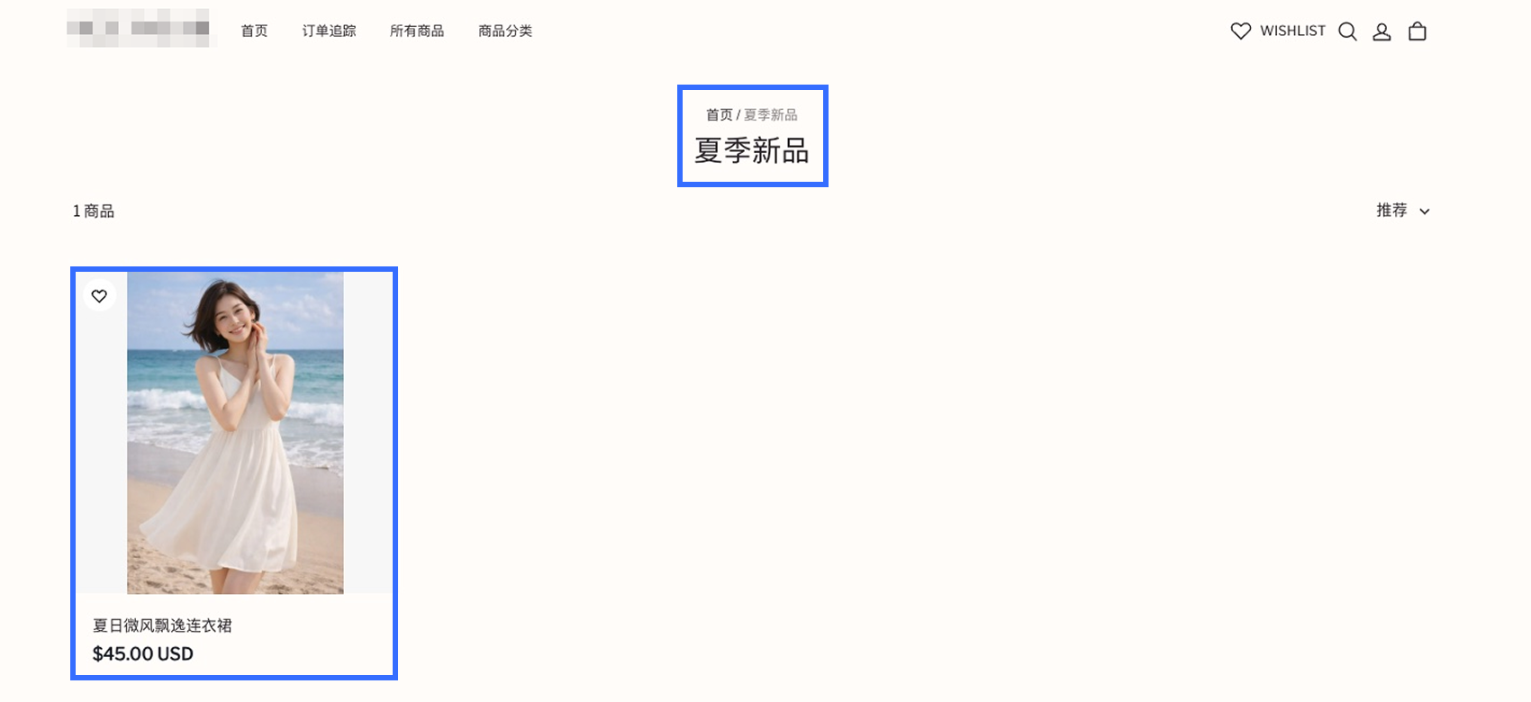 【连衣裙】集合会显示自身商品以及其子分类(夏季新品)中的商品,但不会显示父级分类中的商品。前台显示的商品包括: