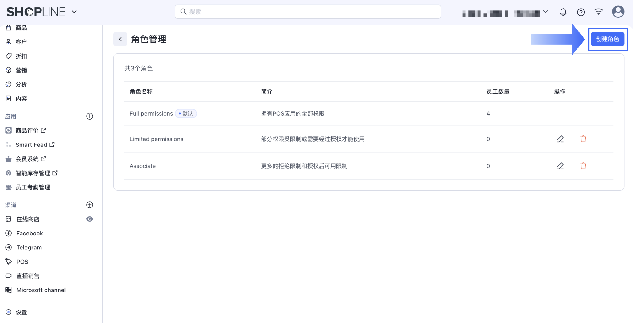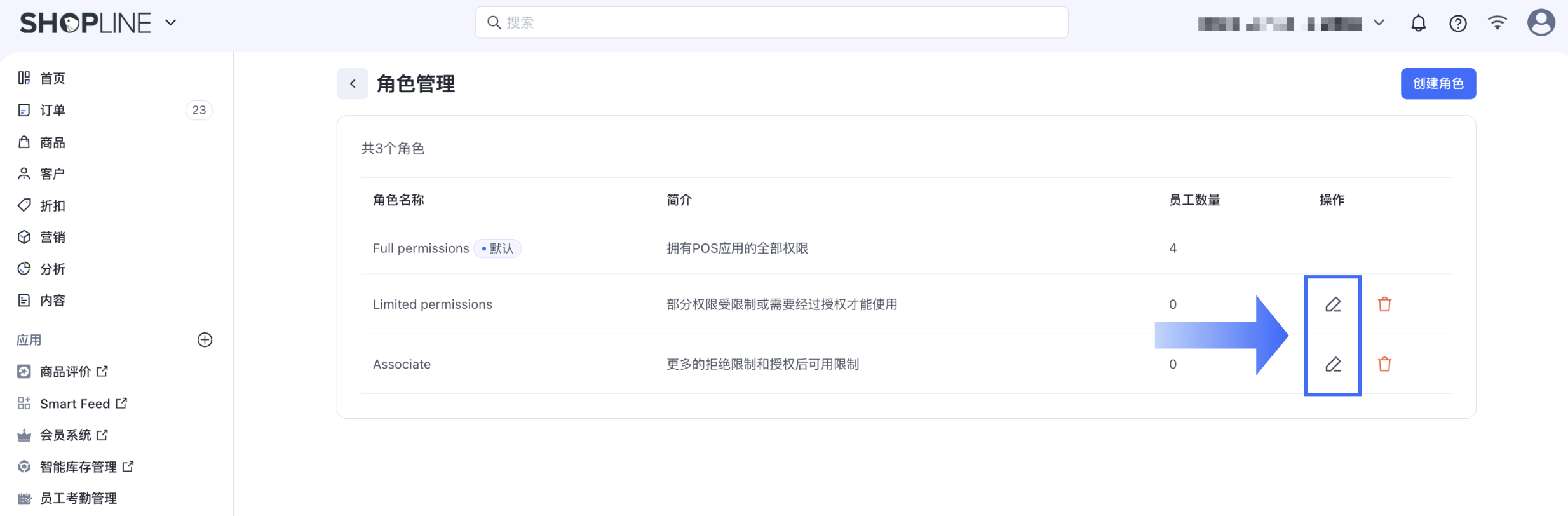 除了创建新角色,您也可以编辑现有角色的权限:通过【角色管理】页面的【编辑】功能,进入【编辑角色】页面设置「礼品卡」访问权限。