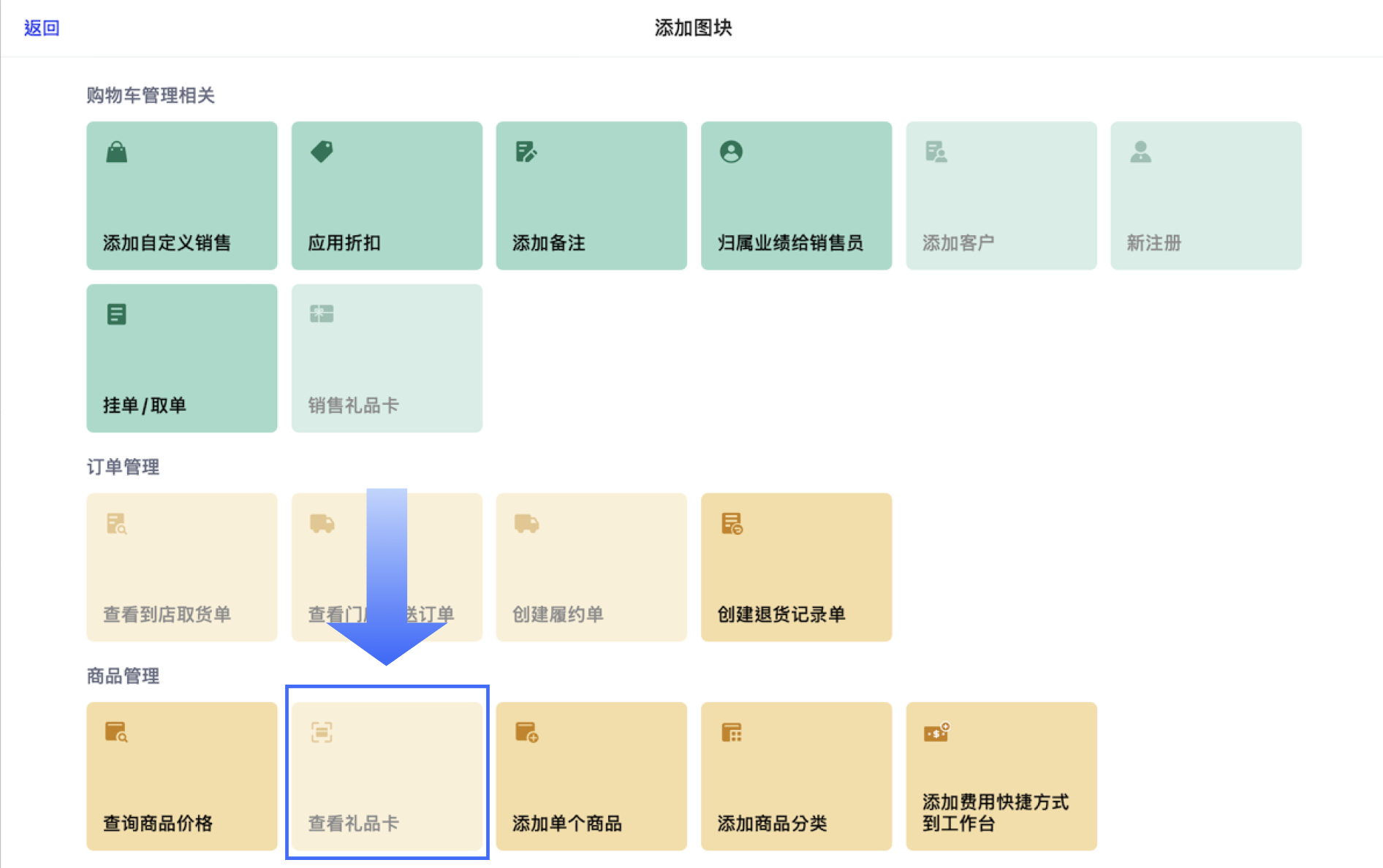 - 在 SHOPLINE POS 应用中,点击【工作台】,然后点击【添加图块】来添加【查看礼品卡】模块。