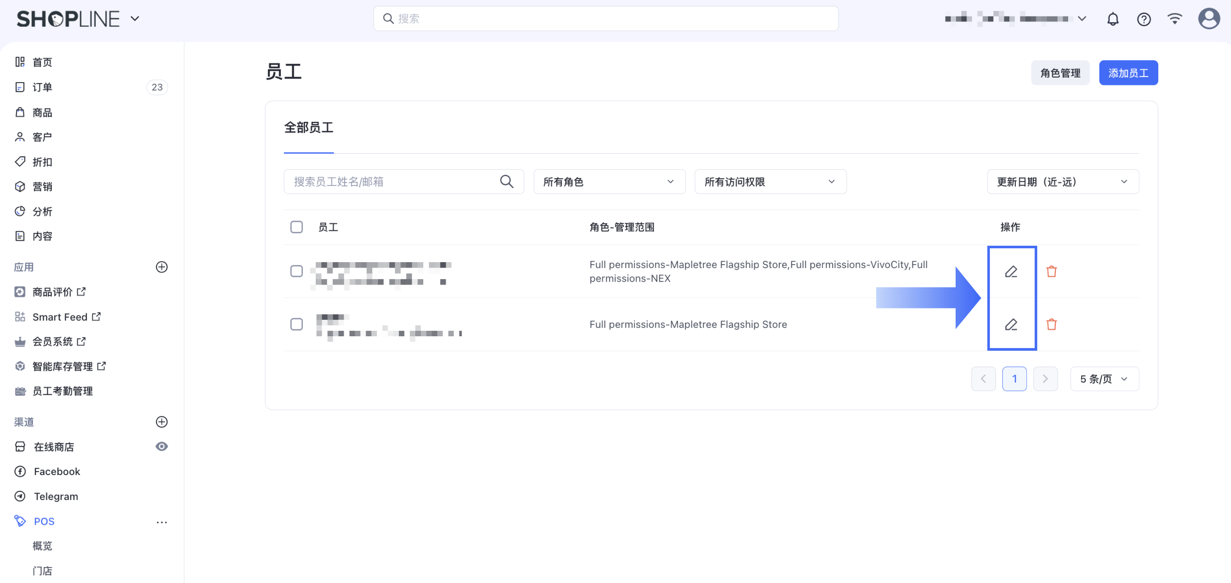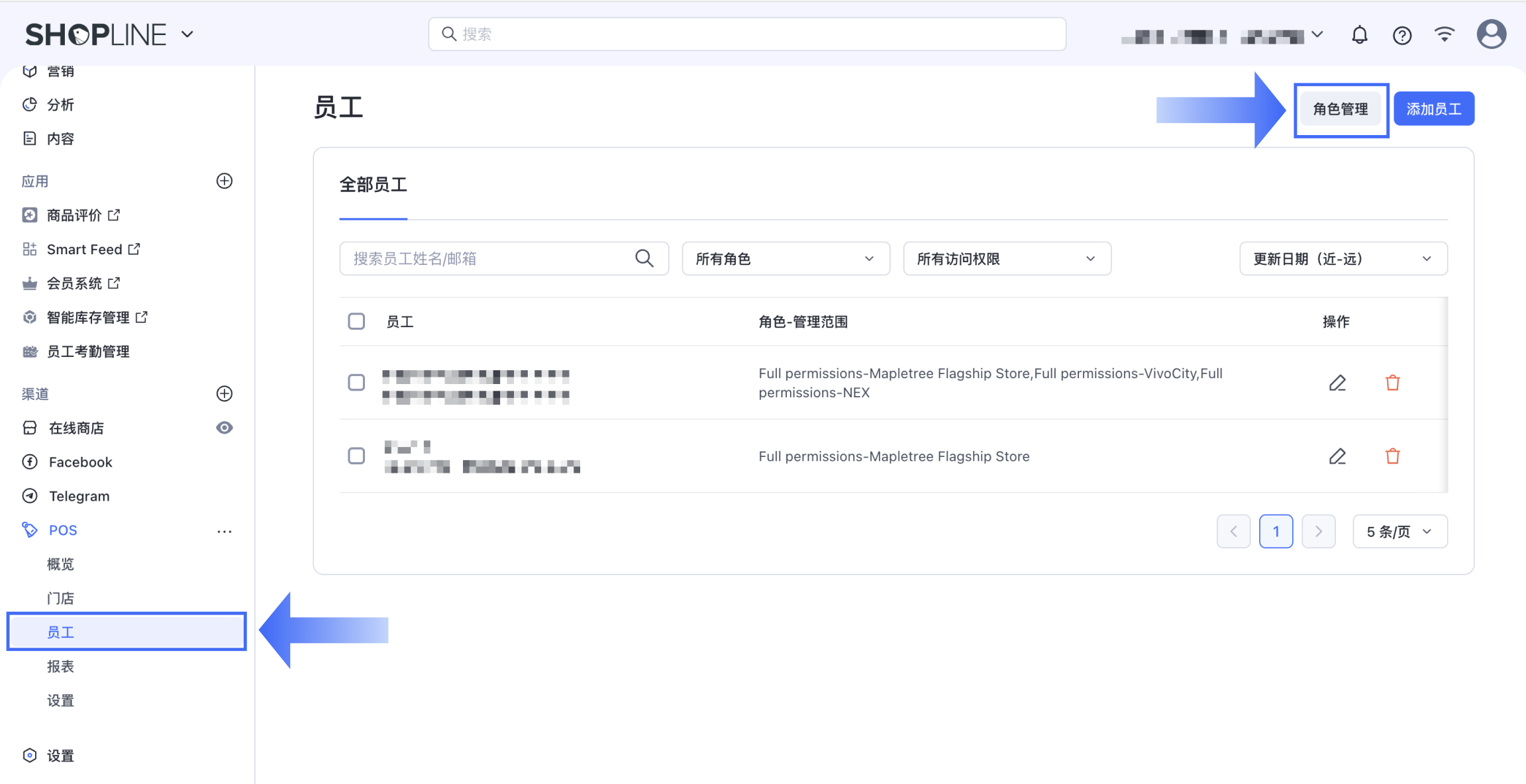 - 登录您的 SHOPLINE Admin,进入 【POS】 并点击 【员工】。