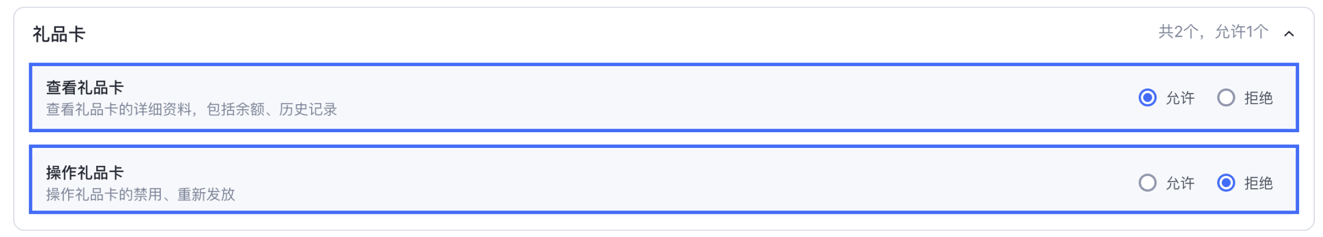 - 【查看礼品卡】权限: 查看礼品卡的详细资料,包括余额、历史记录。
