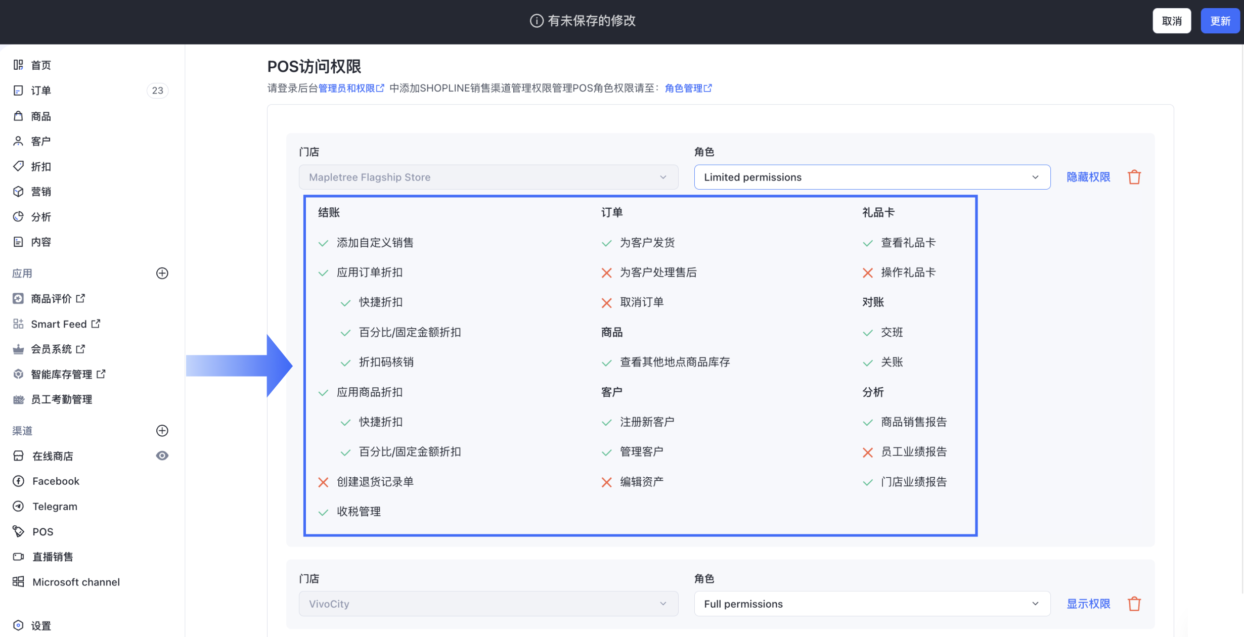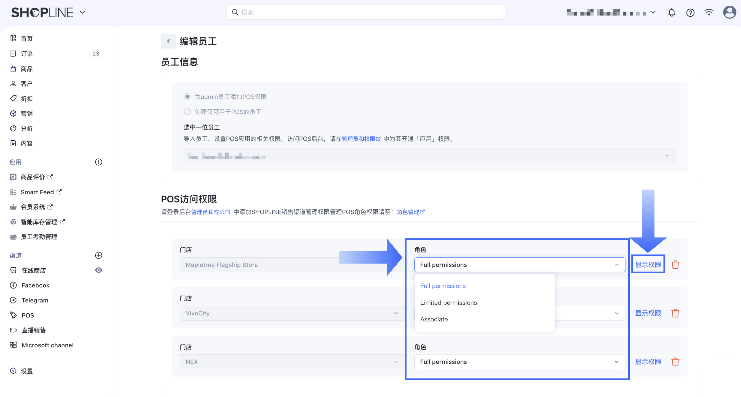 - 在 【POS访问权限】 的部分,您可以设置员工在不同门店的访问权限。为了能更方便地让您一目了然角色与权限,您可以按 【显示权限】。