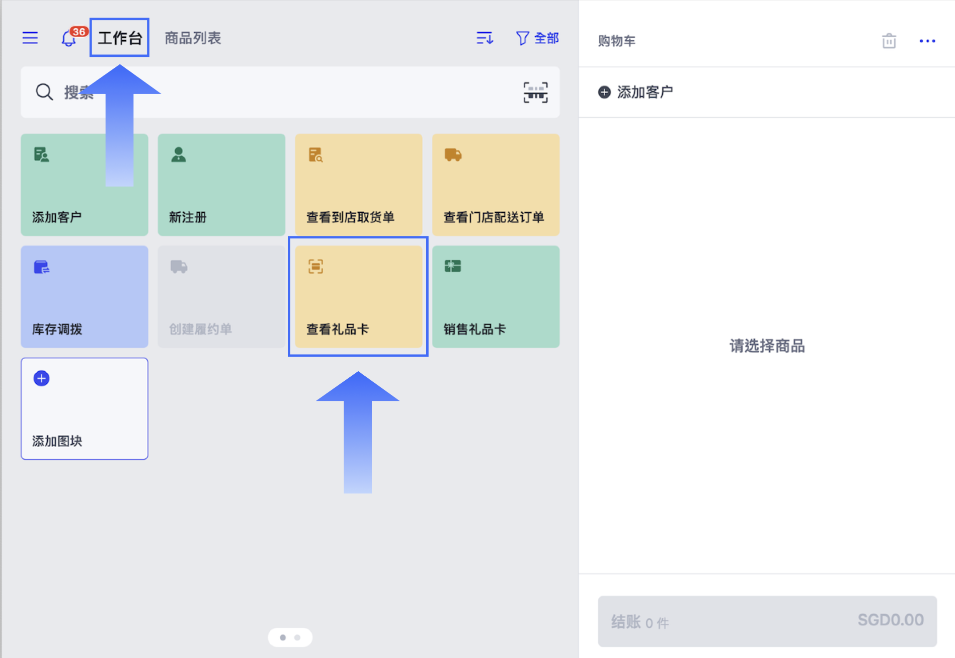 - 回到 SHOPLINE POS 应用中,点击【工作台】,然后点击【查看礼品卡】。