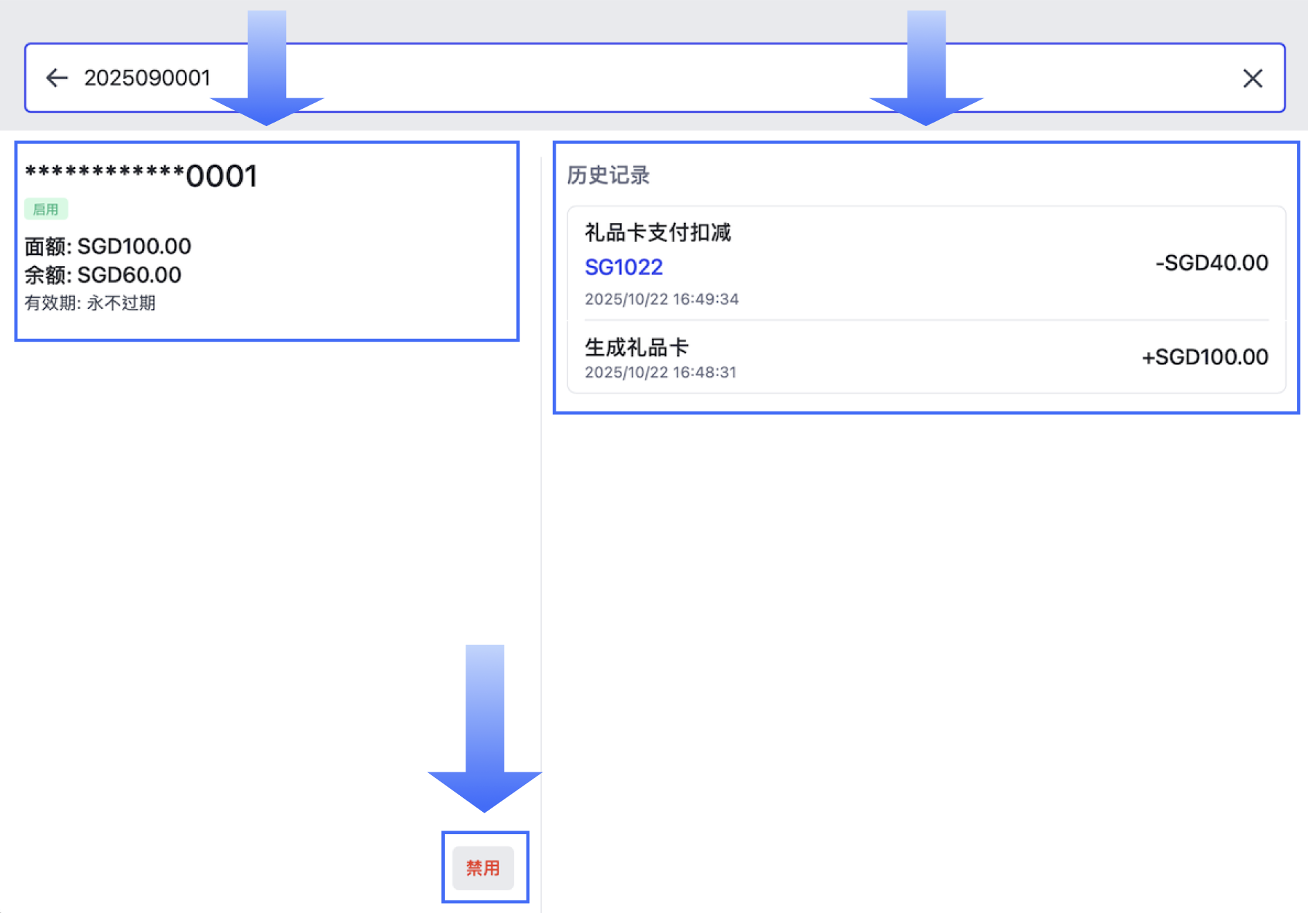 - 如果需要,可点击【禁用】执行停用礼品卡的操作。