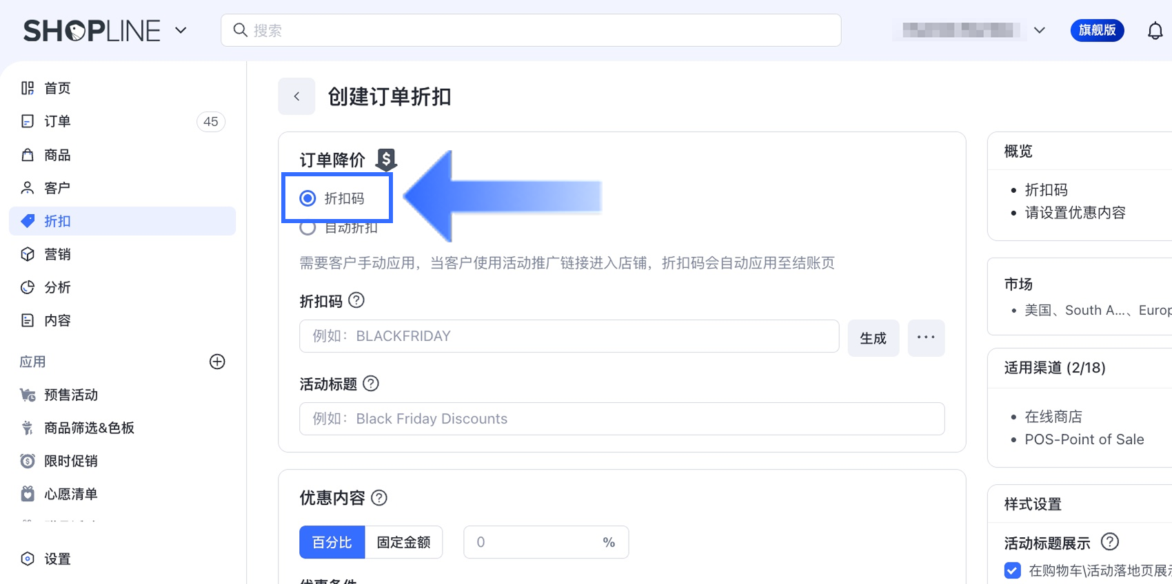 在设置页面中,将折扣类型设为【折扣码】。