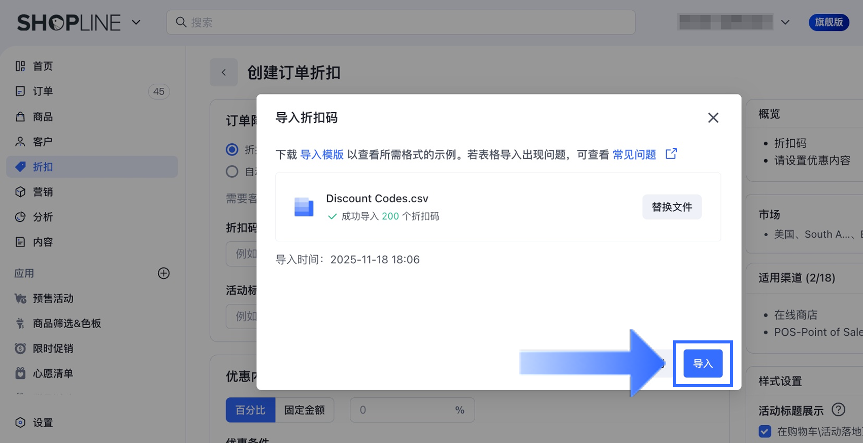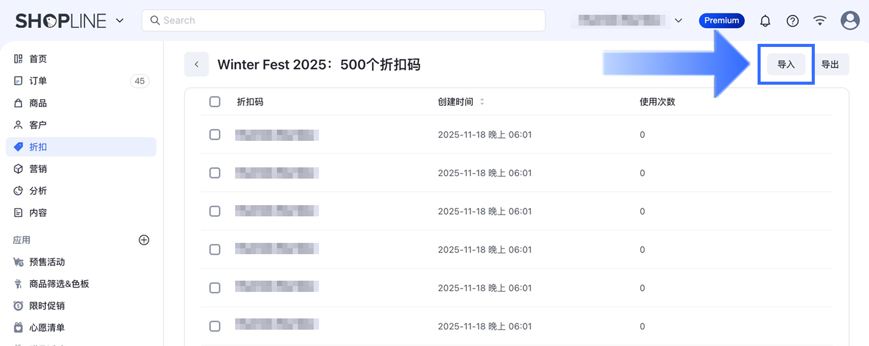 在折扣码列表页面右上角点击【导入】。