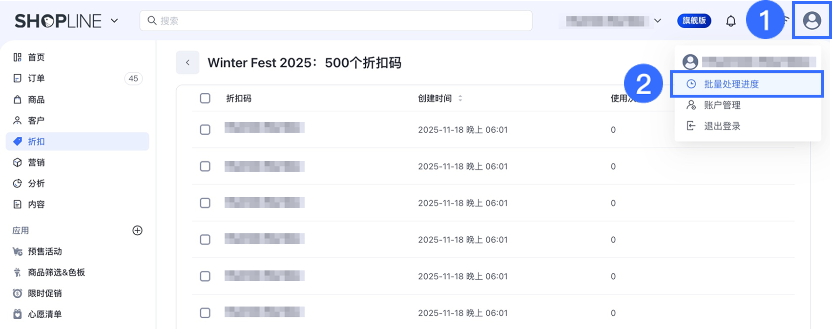 导入过程中,页面会显示已导入的折扣码个数。而在文件处理完成后,建议按以下步骤查看导入结果: