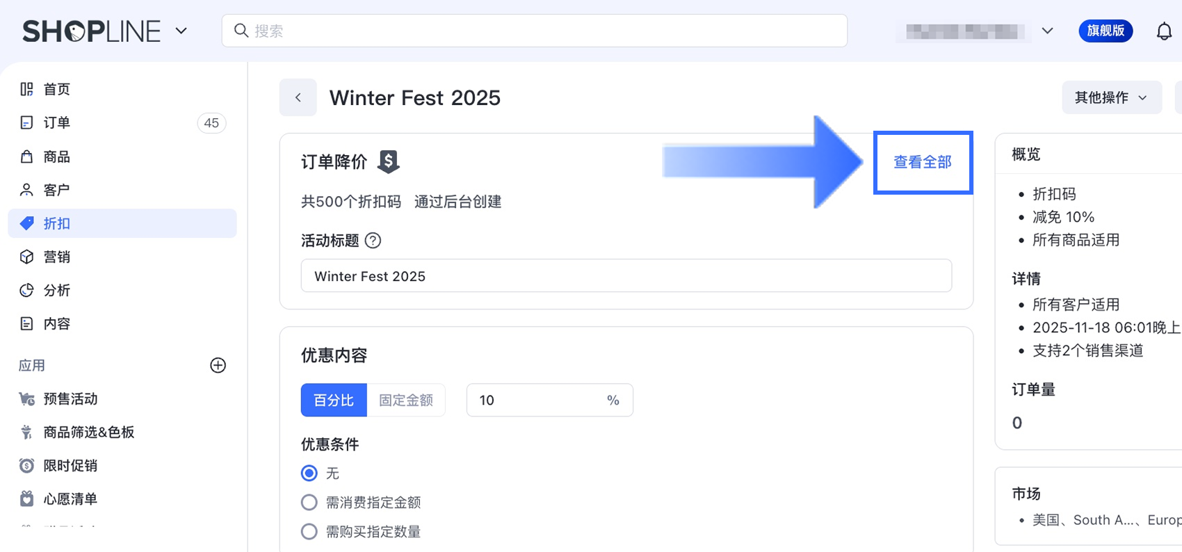 - 进入【折扣】,选择要更新的折扣码活动。