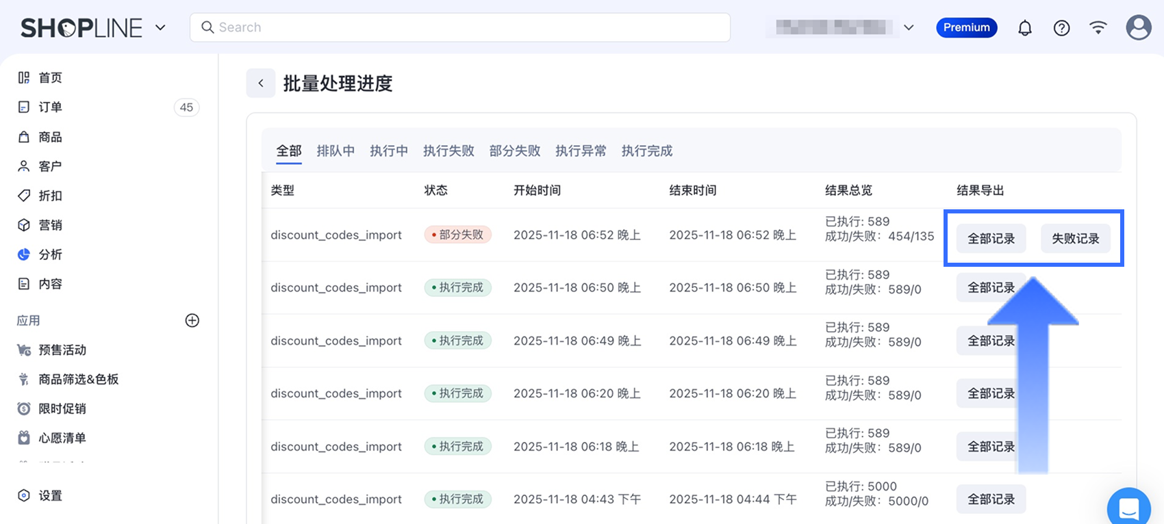 注意:失败的导入不会在【全部记录】中特别标注,请前往【失败记录】查询。 - 若有部分折扣码导入失败,将显示【失败记录】按钮。点击即可下载包含未成功导入折扣码的文件。