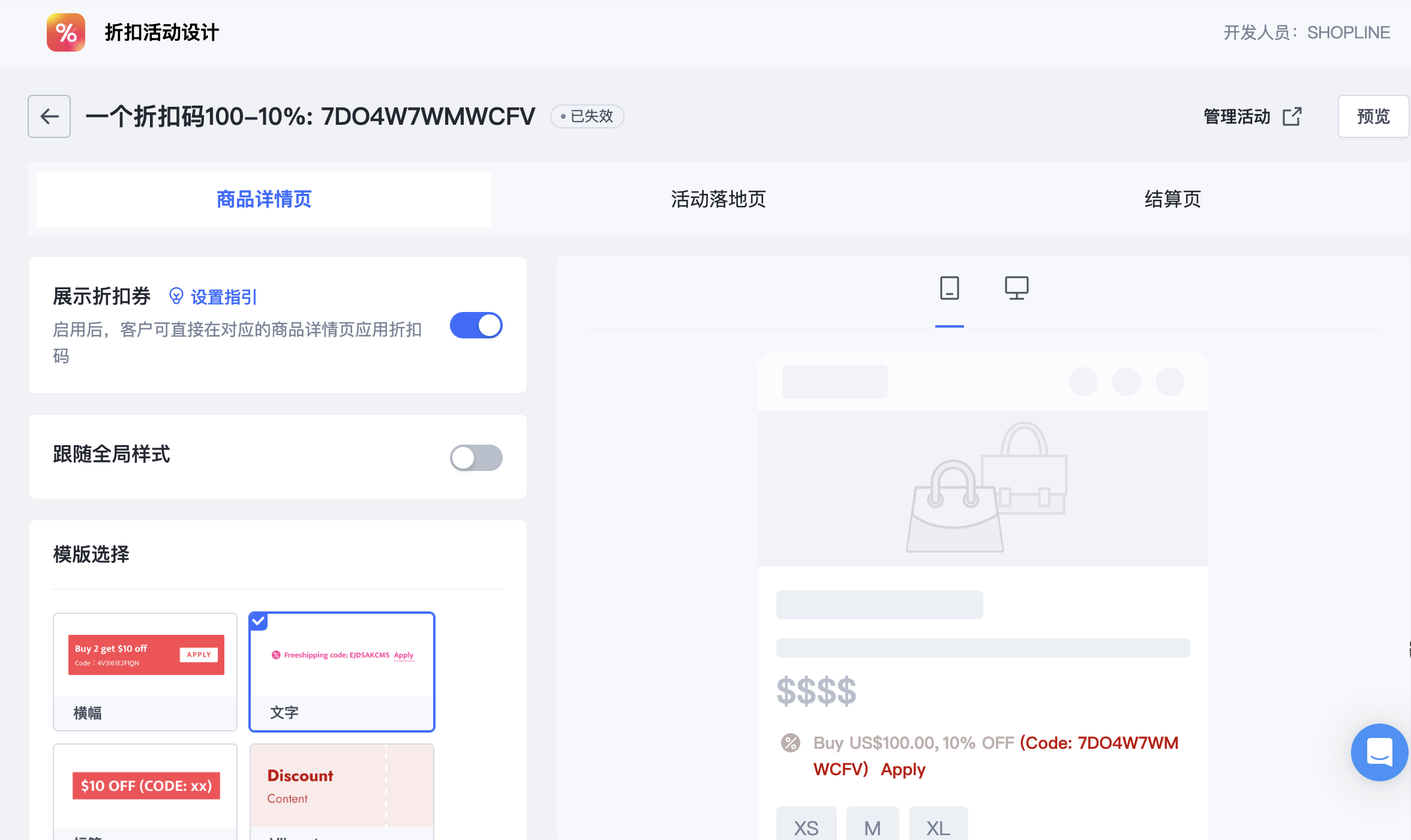 - 折扣码活动在商品详情页的展示样式是活动维度的设置,您可以将不同的活动设置为不同的样式,也可以不展示某些活动