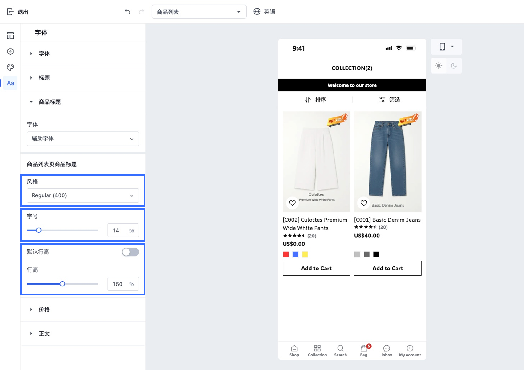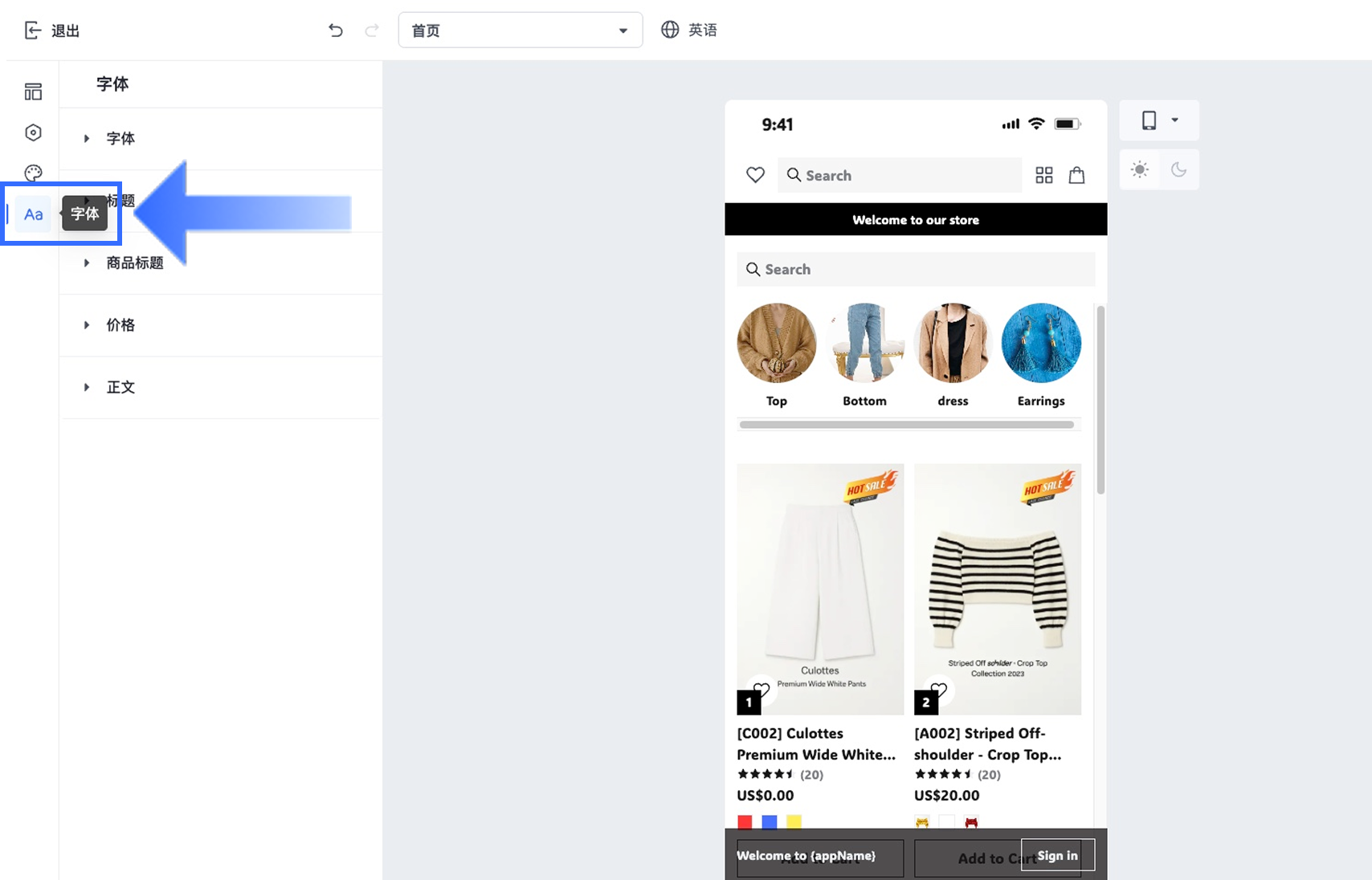 - 在 App 设计编辑器的【字体】面板中,点击【商品标题】。