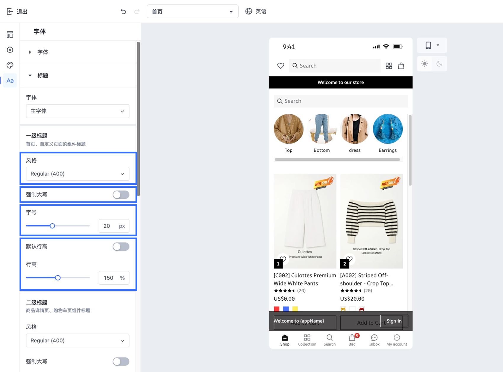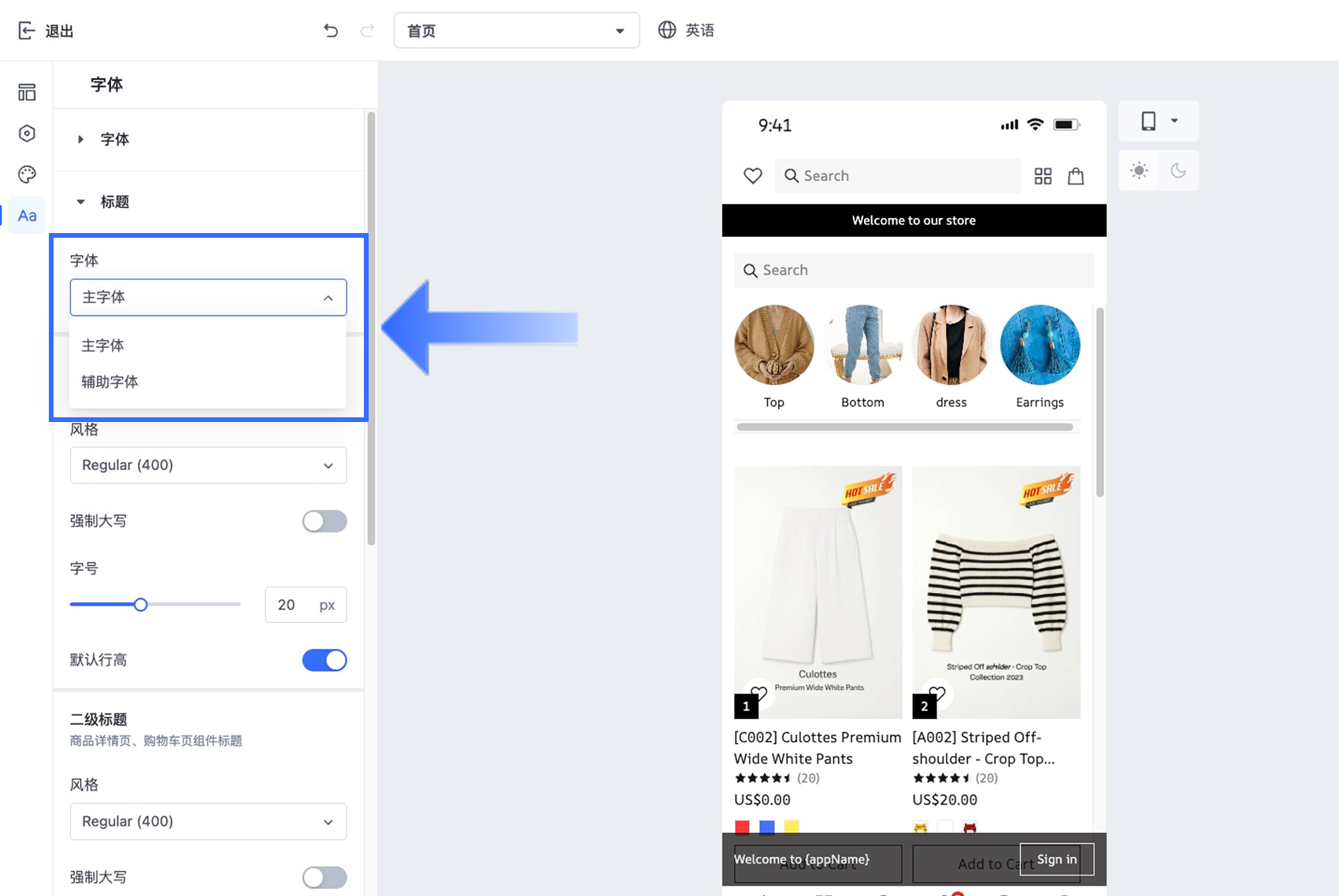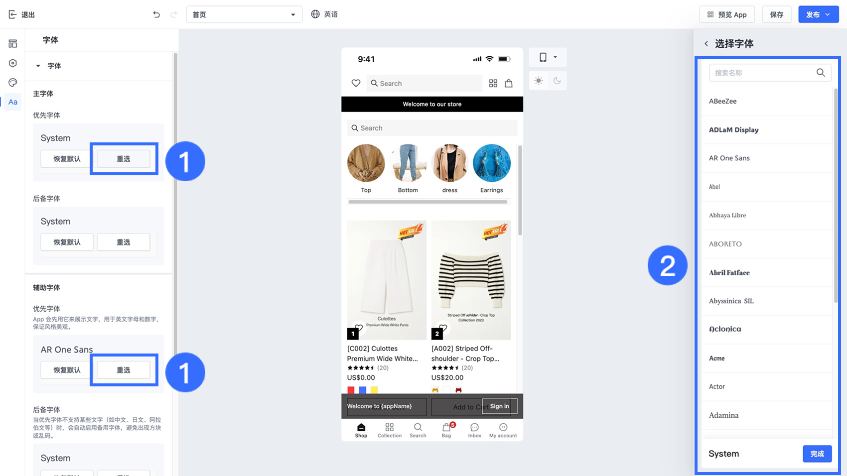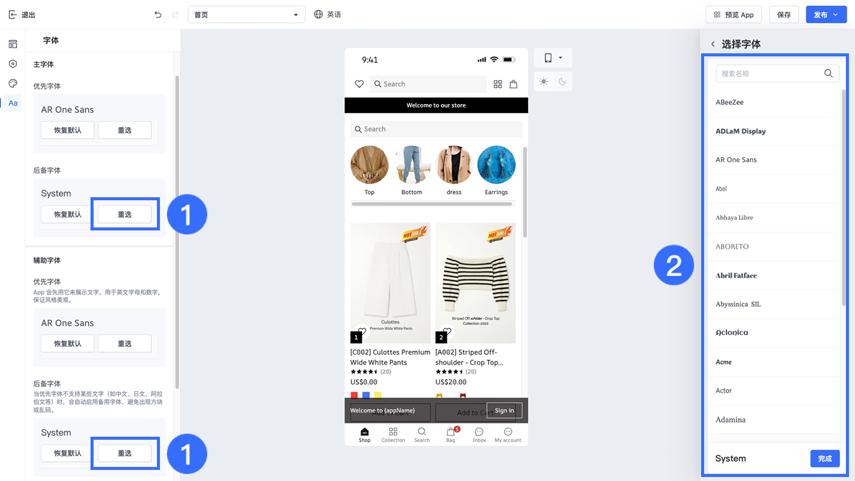 在 App 设计编辑器中,您可以设置【主字体】和【辅助字体】,并针对标题、商品名称、价格及正文等关键内容区域精细调整字体样式。所有可用字体均来自 Google Fonts,可确保在不同设备上的兼容性与稳定显示效果。