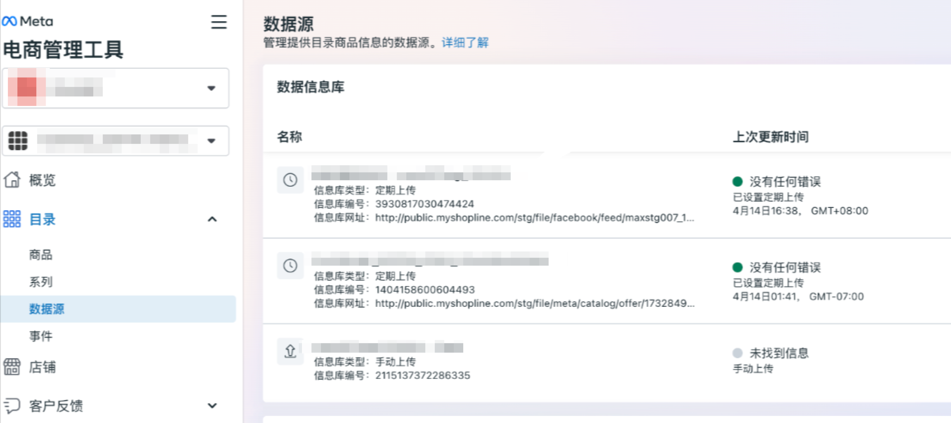 - 登录您的 Business Manager(BM)账号,前往 设置 > 数据源,将 XML 数据源上传至您的 Meta 商品目录。