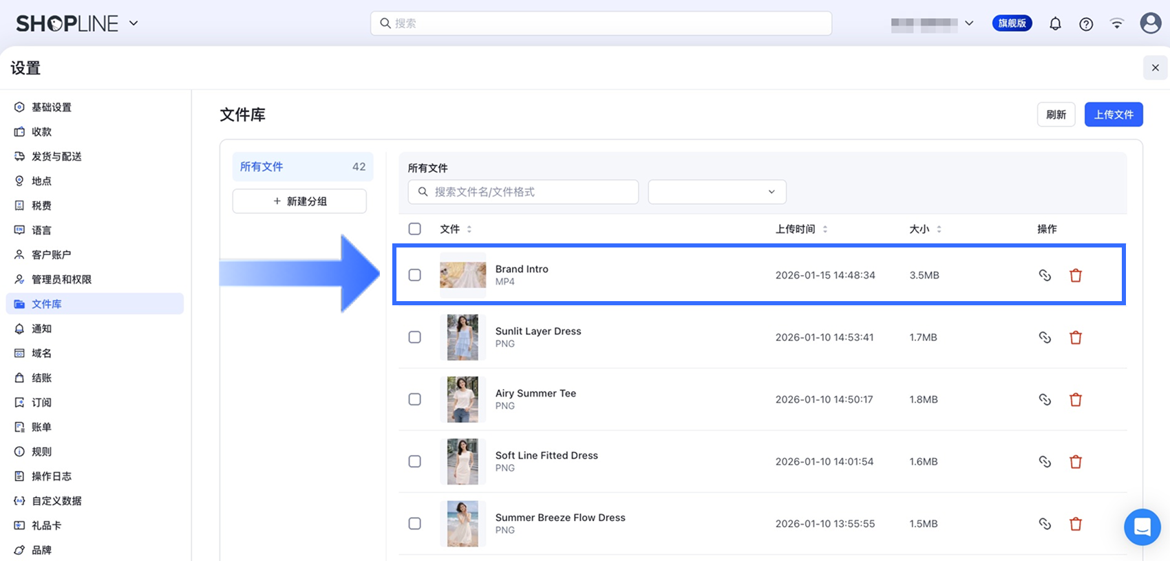 - 在 SHOPLINE 后台管理面板中,前往 【设置】>【文件库】。
