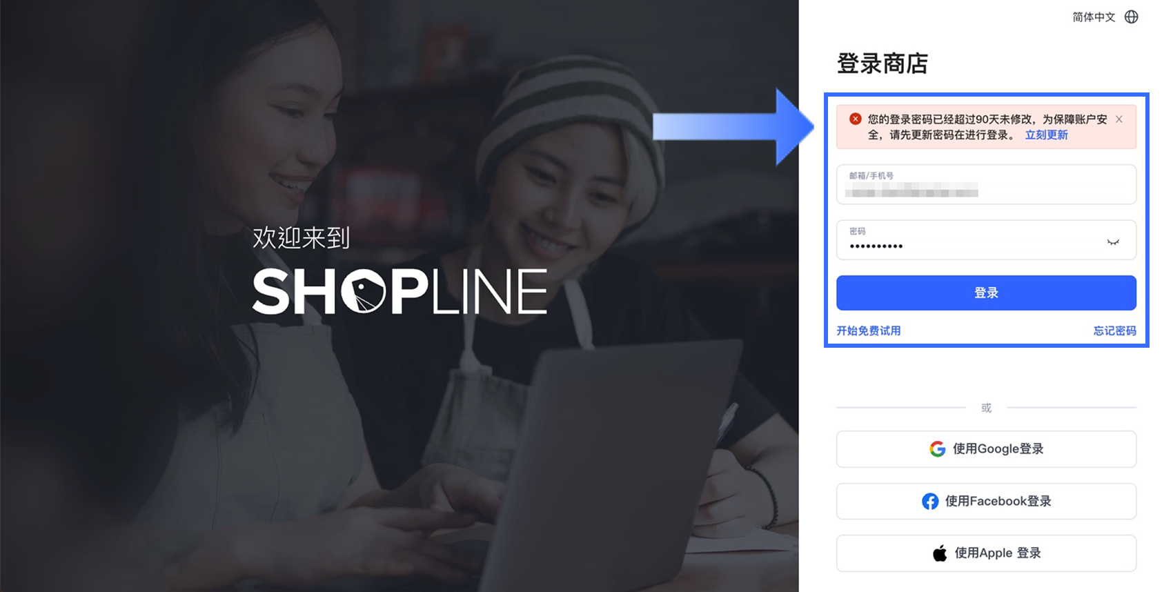 自 2026 年 1 月 12 日起,SHOPLINE 将实施统一的密码规范及 90 天密码到期机制,以进一步提升账户安全性,降低未经授权访问的风险。