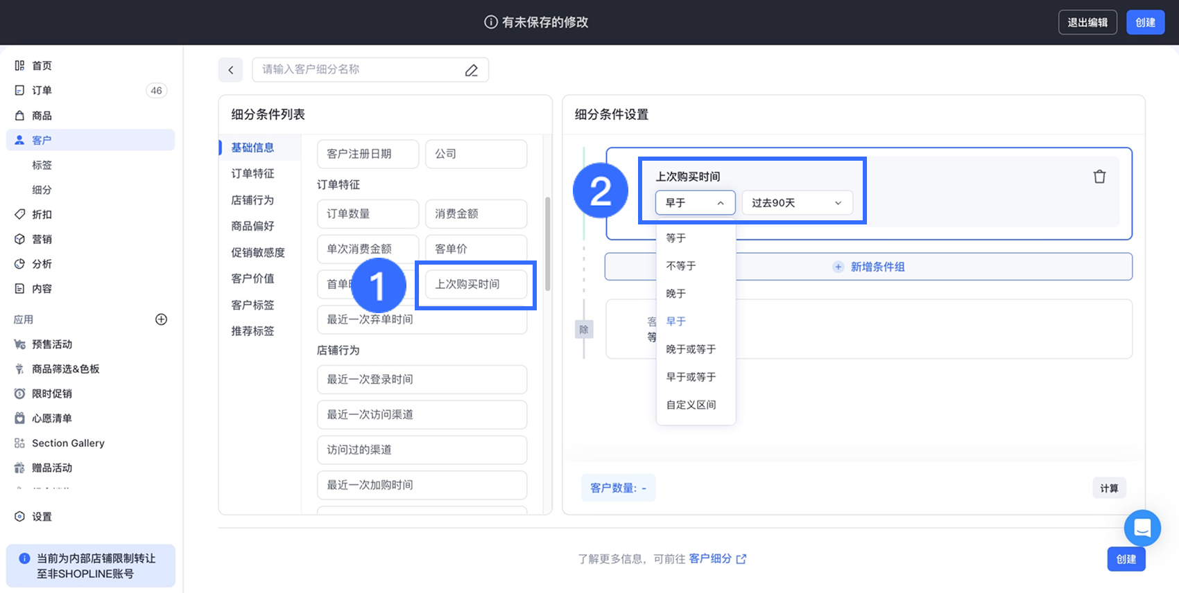 例如,设置「最后下单日期早于过去 90 天」这样的条件,即可持续锁定沉睡客户。这类滚动时间条件有助于基于客户生命周期进行分群,支持常态化的唤醒与留存营销活动。