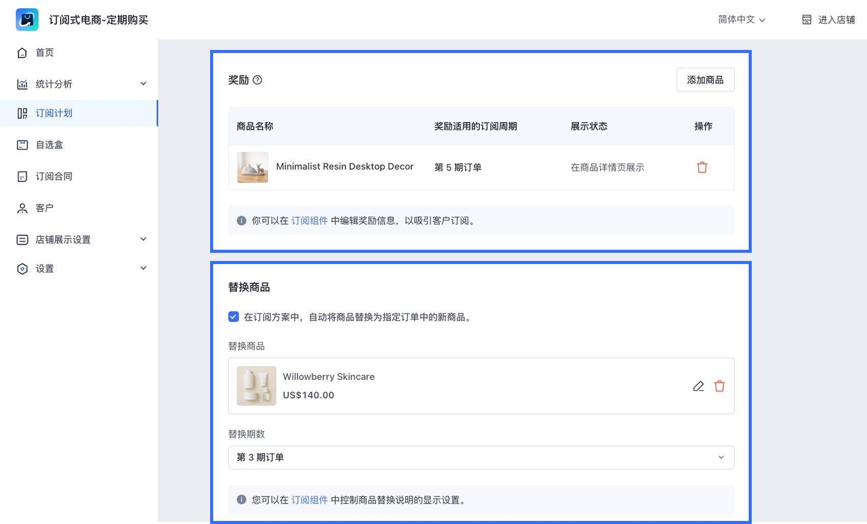 订阅式电商:通过灵活订阅与会员奖励提升留存 【订阅式电商】 应用推出多项新工具,帮助您更高效地管理订阅业务并提升客户留存: 灵活的合约更新:可编辑折扣码、手动创建合约,并在进行中的订阅中新增或替换商品。 批量高效管理:通过批量操作或 CSV 上传,一次性更新多个合约,减少人工处理时间。 以留存为核心的激励机制:在指定账单周期提供免费赠品,回馈订阅用户并培养长期忠诚度。 👉 了解更多