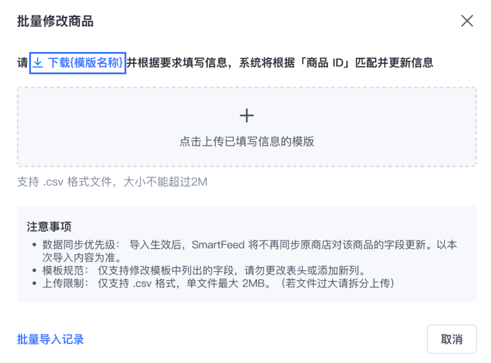 返回批量编辑弹窗,点击「导入」,上传已填写完成的文件。仅支持.csv格式,单文件最大 2MB。(若文件过大请拆分上传)