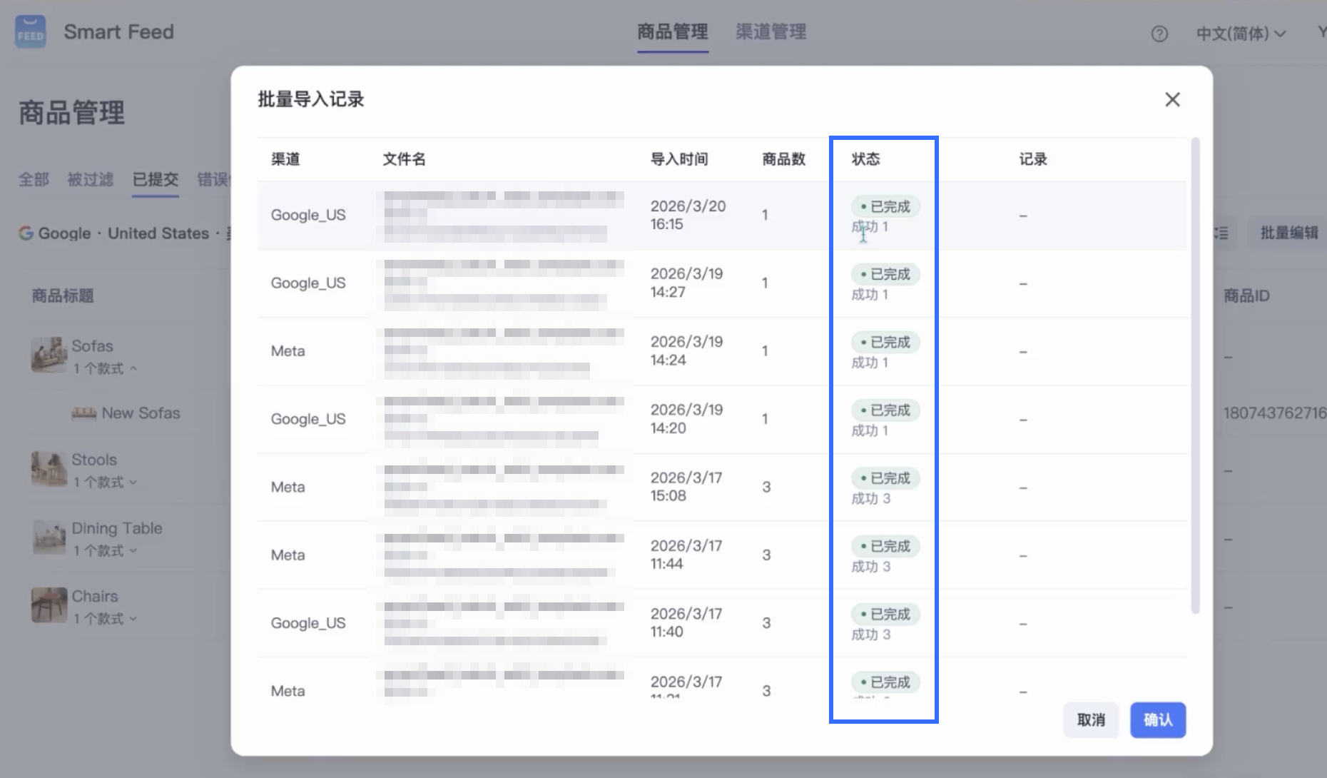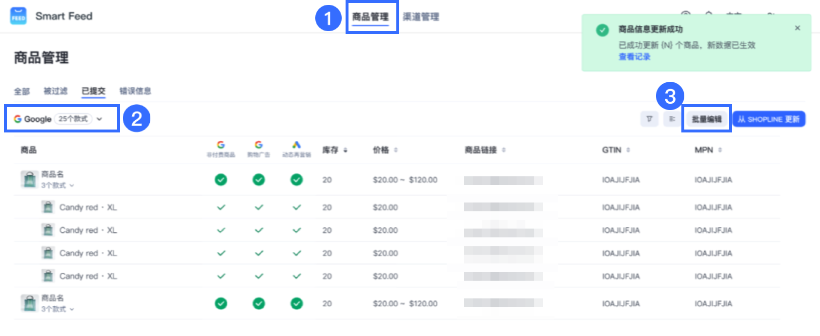 - 前往 Smart Feed > 商品管理 > 选择渠道(Google / Meta)> 已提交 > 批量编辑