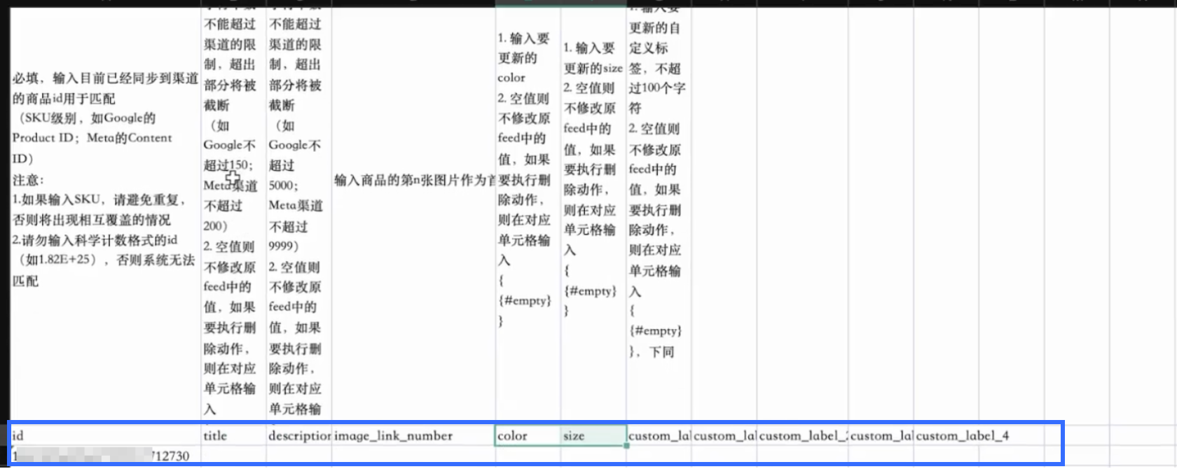 - 必须填写为已同步至渠道的 SKU ID(如 Google 的 product id / Meta 的 content id)