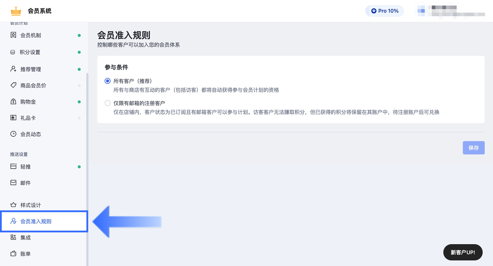 默认情况下,您的店铺设置为允许所有客户参与会员计划。如需更改参与资格策略,请按照以下步骤操作: