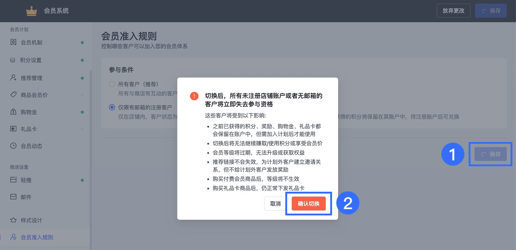 通过调整这些规则,您可以管理客户加入会员计划的方式,鼓励客户注册账户,并更好地控制积分与会员权益的发放。