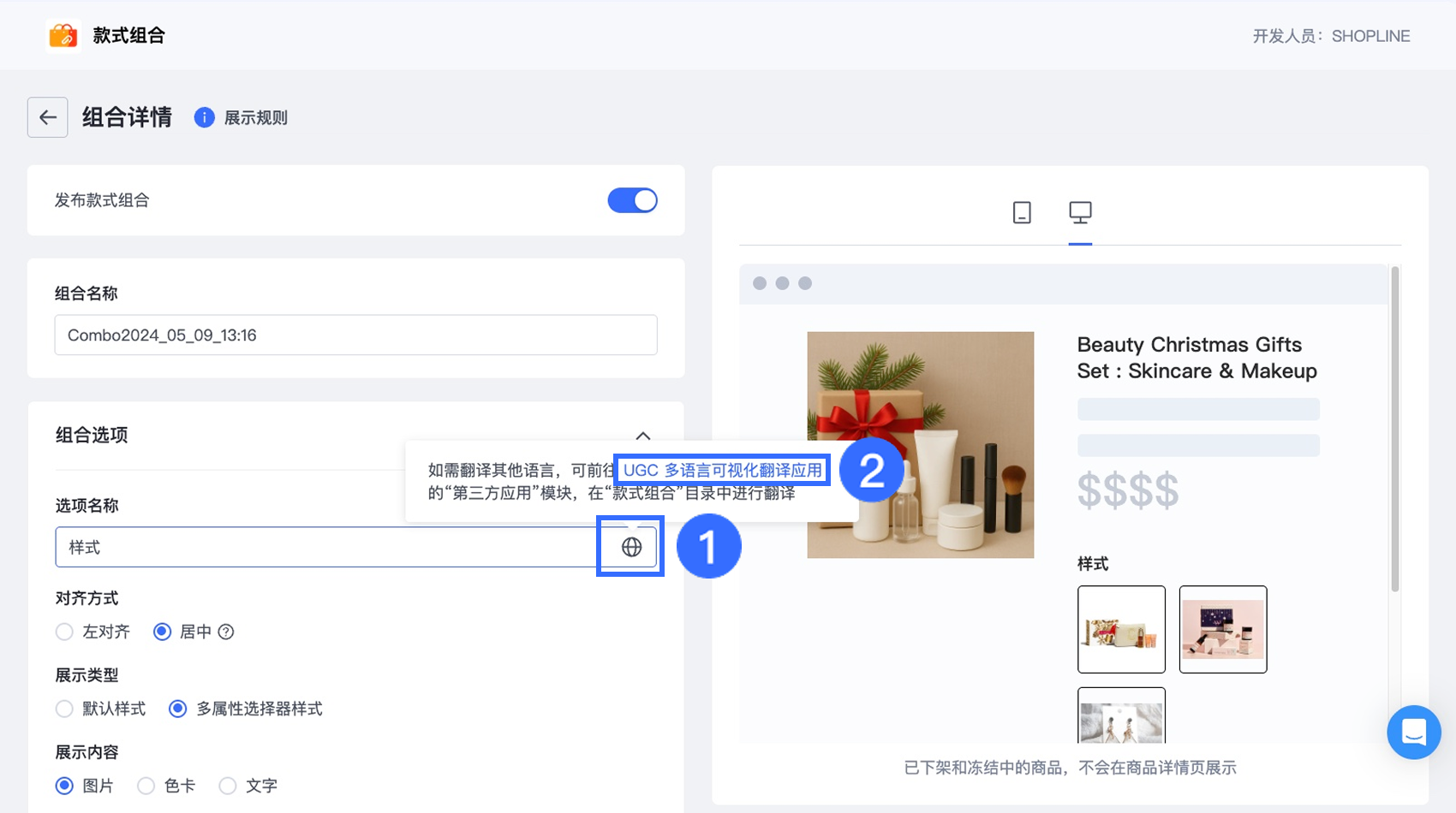 【款式组合】应用现已支持在店面以多语言展示组合名称。通过与【UGC多语言可视化翻译】应用集成,您可以为不同市场配置本地化文案,让顾客在浏览时看到对应语言的组合名称。