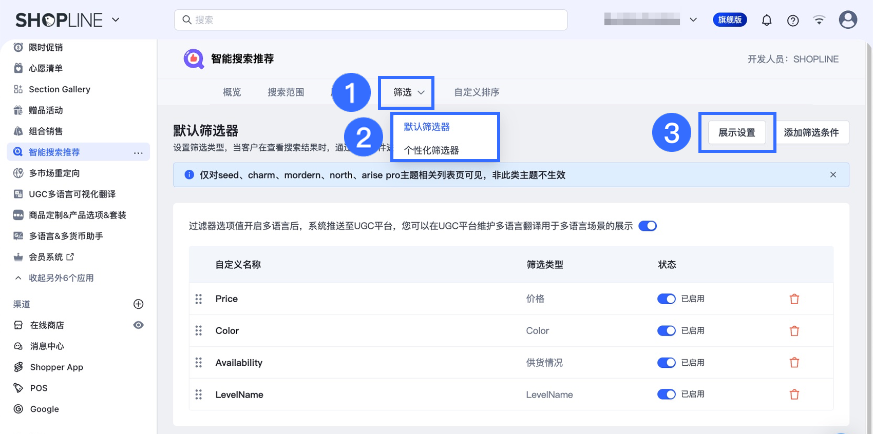 【智能搜索推荐】应用中的筛选器自定义样式功能,可能与【商品筛选&色板】应用的筛选器样式功能发生冲突。 若两个应用同时生效,可能导致商品列表页或所有商品页的前台布局异常。建议仅保留其中一个应用的筛选器功能。