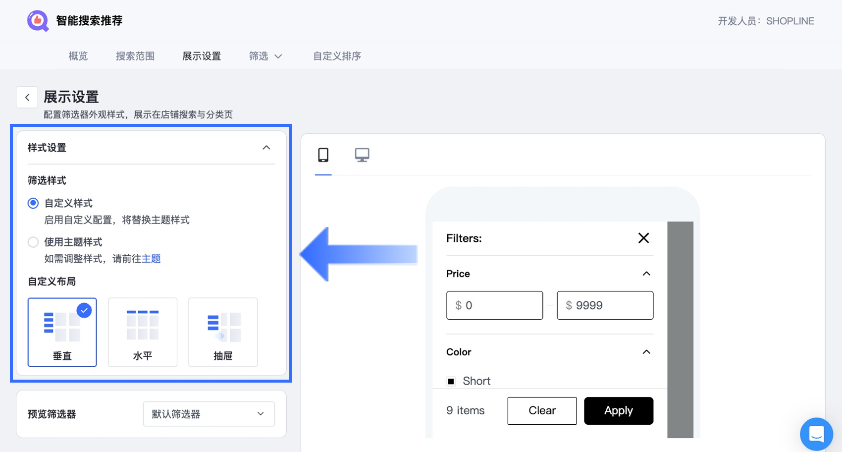【智能搜索推荐】应用中的筛选器【展示设置】允许您自定义筛选器在店铺前台的显示方式。通过调整布局、样式和展示行为,您可以为顾客打造更直观、易用的筛选体验。