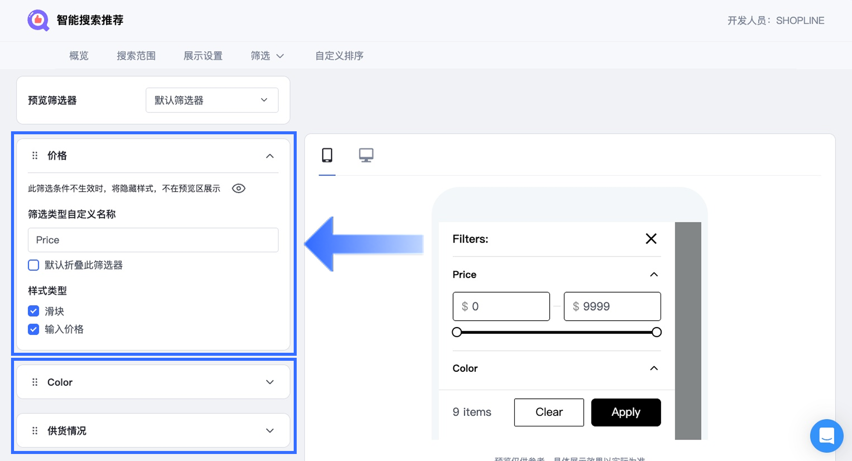 根据步骤 3 所选择的筛选器类型,将显示对应已设置的筛选条件。您可以针对每个筛选器(如价格、颜色)分别进行展示设置。可配置项包括: