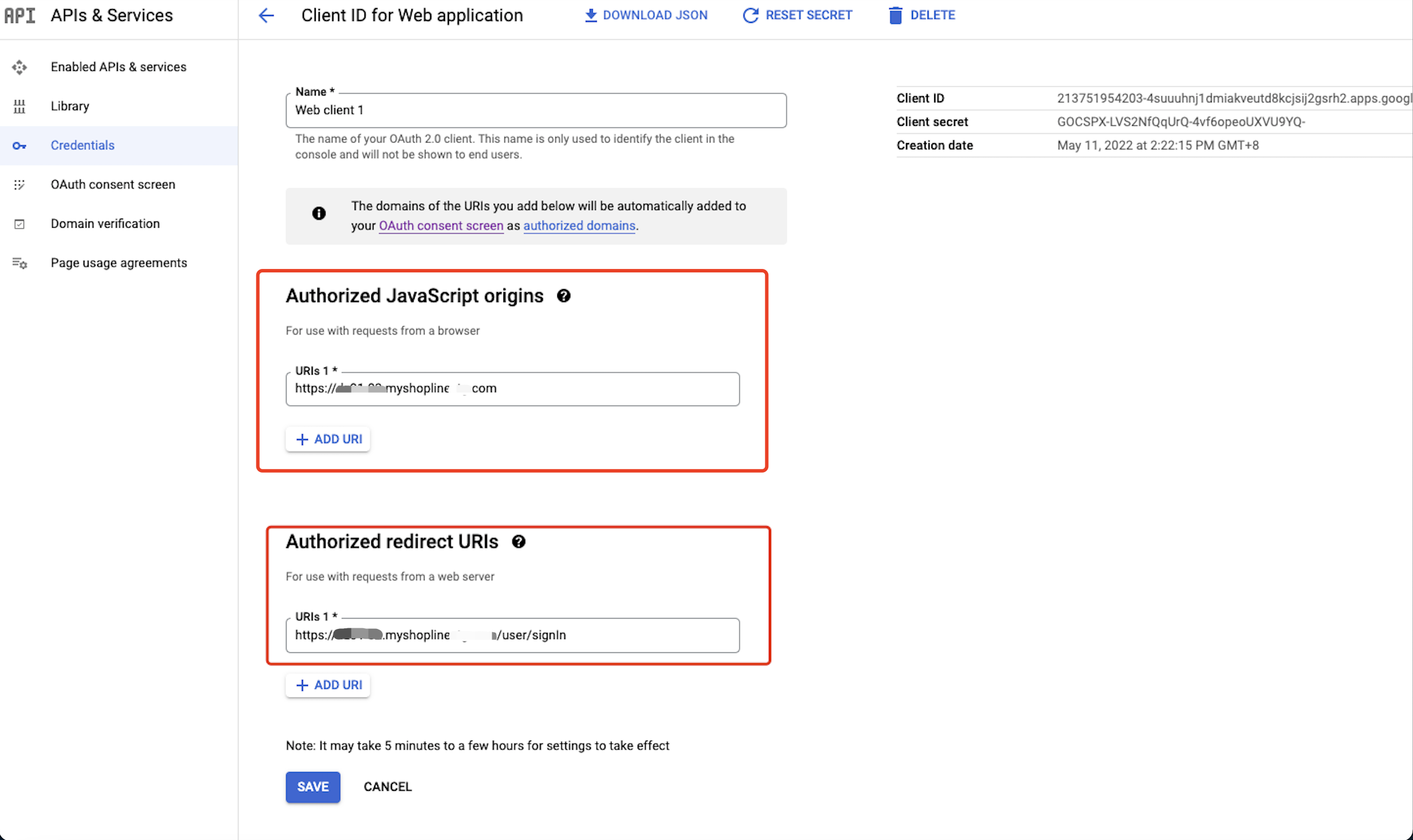 - 已获得授权的 JavaScript 来源:把域名填入【URl】,此处需要填写您的店铺前台网址。